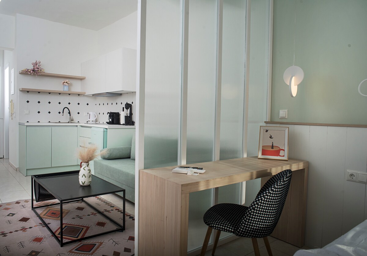 Nedavno, potpuno renovirani studio na 1. spratu u srcu Kalamate, u neposrednoj blizini Centralnog trga i Međunarodnog plesnog centra. Ima 1 bračni krevet i potpuno opremljenu kuhinju. Moderan, dobro namješten i potpuno funkcionalan. Pogodan je za parove, porodice s bebama, profesionalce ili bilo koga drugog ko želi opuštanje i spokoj.