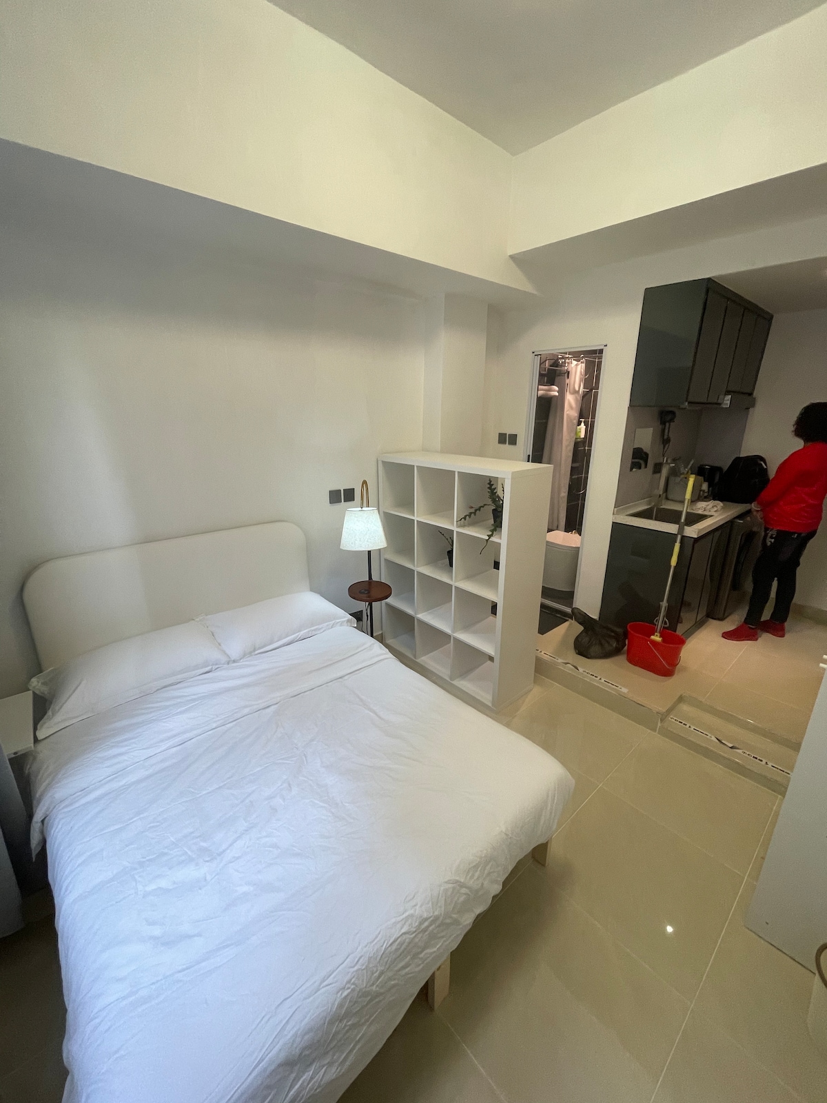 A comfy flat preferrably for girls. The bedroom is equipped with an air purifier and an air conditioner. The living room is spacious enough for you as a solo to have a nice rest after your city tour.