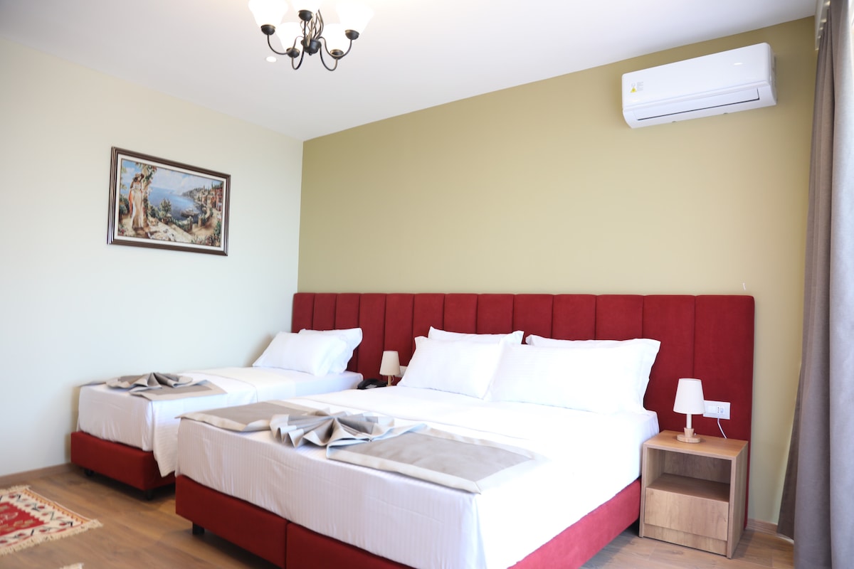 Dobro došli u naš luksuzni penthouse u blizini dvorca Kruja i Starog bazara! Na 5. spratu (bez lifta), smještaj prima 8 gostiju sa 3 spavaće sobe, 2 kauča na razvlačenje, kuhinjom, Wi-Fi mrežom, klima uređajem u dnevnom boravku i glavnoj spavaćoj sobi. Druge dvije spavaće sobe ostaju hladne s otvorenim prozorima i mrežama protiv komaraca, što je često bolje od klima uređaja! Uživajte u sjajnom pogledu, nekoliko koraka od trgovina, kafića i besplatnog javnog parkinga. Uključuje društvene igre kao što su karte i Jenga, savršene za porodice ili grupe. Vaša idealna baza za opuštanje ili istraživanje srca Kruje!