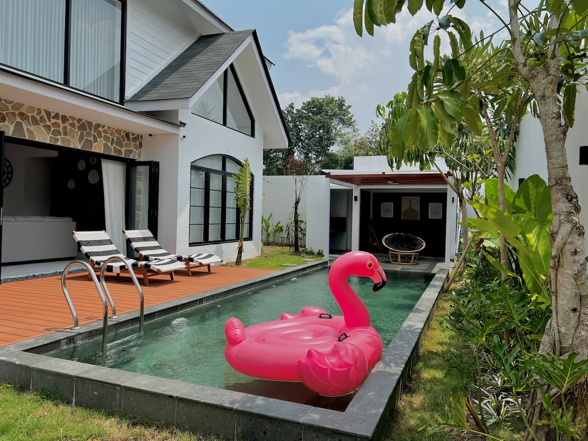 Enjoy our brand new - private family villa in Jogja. 5 spacious bedrooms with AC- luxury family villa with swimming pool, front yard and backyard gardens. Perfect gate away for families & the loved ones, for office retreats, or photoshoots. Your family home in Jogja.
