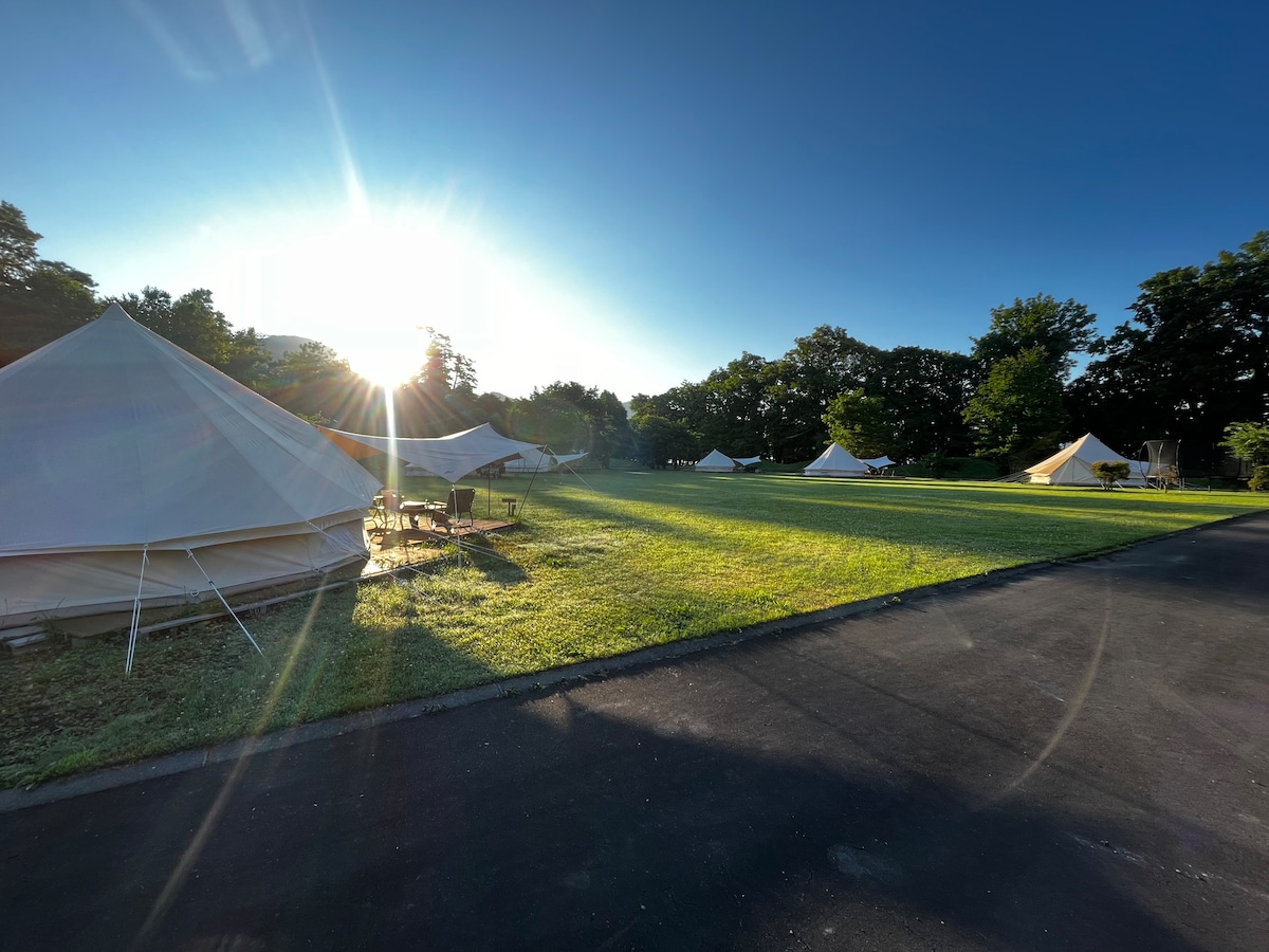 Probudite se na stepenicama od jezera Tōya u elegantnom glamping šatoru koji može primiti do 4 osobe, s vlastitom terasom, roštiljem i mirnim pogledom na prirodu. Uživajte u privatnom prostoru, ugodnom osvjetljenju i jednostavnom pristupu vožnji kanuom, SUP-u i sl. Potpuno opremljena kuhinja, ognjište i ventilatori koji se mogu iznajmiti te kompleti roštilja prije naručivanja čine ga jednostavnim. Pažljivi detalji, ljubazni domaćini i čarobni zalasci sunca upotpunjuju doživljaj. Savršeno za parove, porodice ili prijatelje. Rezervišite sada za boravak koji nećete zaboraviti!