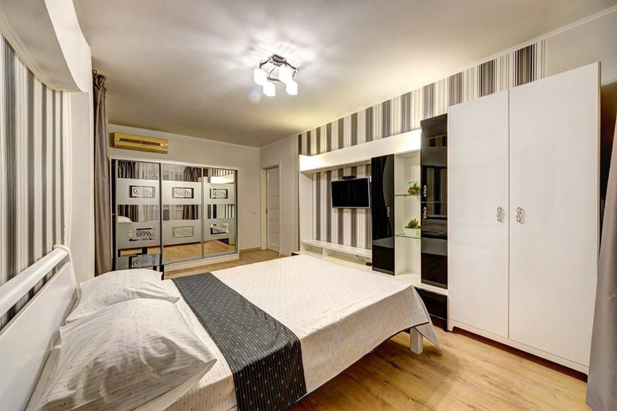 Ovaj stan se nalazi u vrlo dobrom položaju, jer ne možete biti više u centru Kijeva nego u Kreschatiku, Arena City. Moj stan je savršen za uživanje u Kijevu. Osjećaj je topao i udoban tokom hladnog vremena, hladan i svjež za toplije dane. Puna je svjetla, sunca i tišine. Stan ima 3 spavaće sobe s bračnim krevetom, a dnevni boravak je također pronašao kauč. Stan je savršen za veliku porodicu ili grupu od 2 do 6 osoba. Prostorija za opuštanje s okruglim jacuzzijem, privatna sauna)