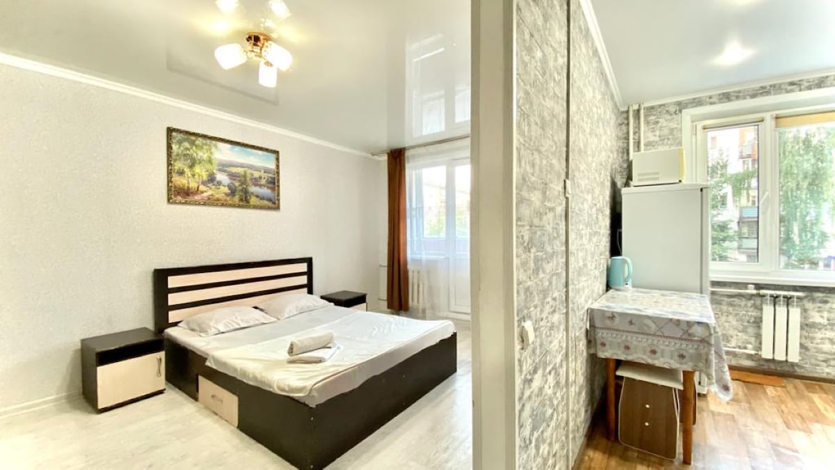 Jednosobni apartman poslovne klase s velikim bračnim krevetom i dodatnim krevetom - kauč na razvlačenje za 2 osobe. Postoji klima uređaj i balkon. Stan se idealno nalazi u centru grada u ulici Nazarbayev 134 (Mira) (raskrsnica s Abayem) Sokol Supermarket District, Mag. Romantično. Stan s novim renoviranjem i namještajem, bez stranih mirisa, nije dimljen i savršeno očišćen, fotografije se podudaraju.