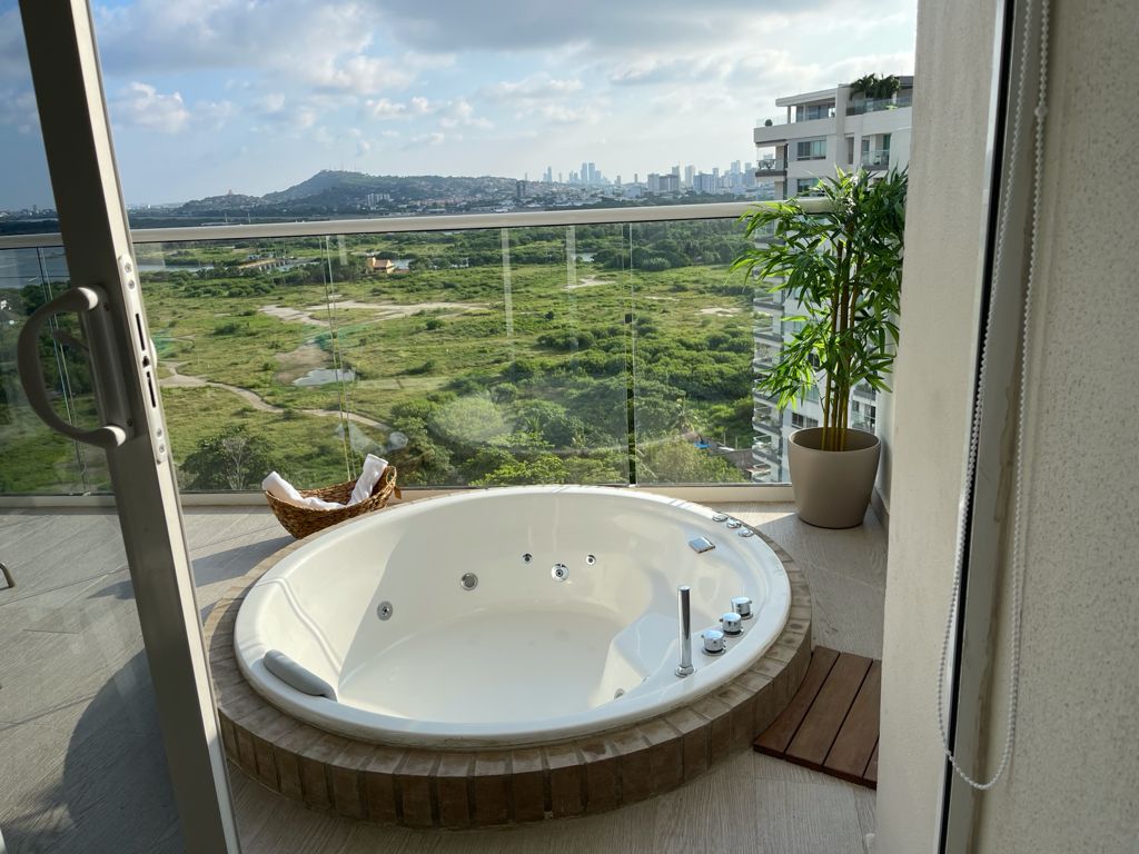 Otkrijte uzvišeni luksuz u našem apartmanu s pogledom na okean na 34. spratu, The ICONZ Sky Residence, smještenom u najsigurnijem i najekskluzivnijem području Cartagene, nekoliko koraka od plaže i 5 minuta od grada iza zidina Probudite se iznad horizonta Cartagene s pogledom kroz prozore od poda do plafona i opustite se na ogromnom udobnom balkonu. ODUŠEVIT ĆETE SE: ✨Moderan dizajn i klima uređaj u svim prostorijama ✨Nevjerovatan bazen, teretana, sauna, 24-satno osiguranje ✨Sobarica i konsijerž ✨Vrhunski madrac, posteljina i jastuci ✨24-satna samostalna prijava uz pametnu bravu ✨Pametni televizori