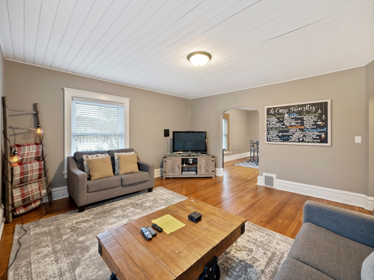 Uživajte u udobnosti i eleganciji u ovom historijskom smještaju La Crosse, WI s tri bračna kreveta, dva odvojena kreveta i dva bračna kauča za spavanje. Kuća se može pohvaliti gurmanskom kuhinjom s velikim frižiderom, štednjakom, mikrovalnom pećnicom, tosterom i aparatom za kafu. Sadržaji uključuju besplatan bežični internet, brzi internet, kablovski HDTV od 55", dasku za peglanje, peglu i besplatnu mašinu za pranje/sušenje veša. Smještaj je u potpunosti klimatiziran i opremljen za vašu udobnost. Prošetajte 10 minuta do centra La Crossea punog restorana i prodavnica!