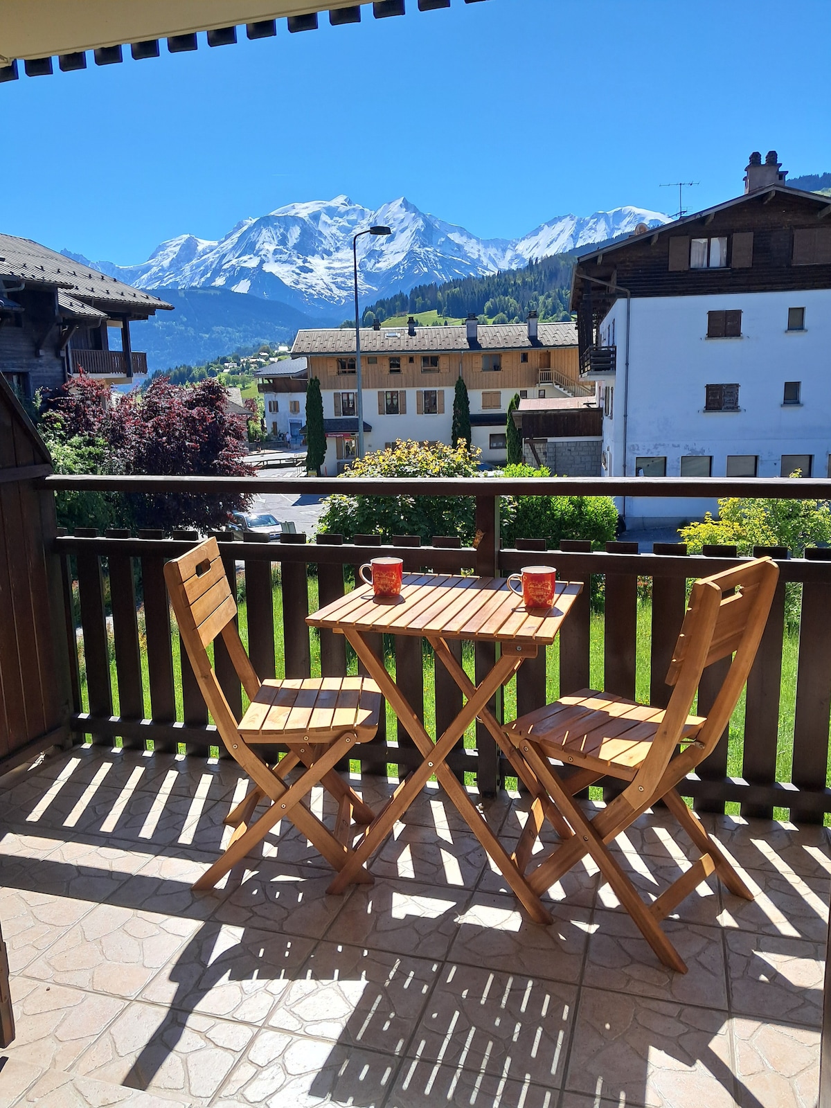 Klimatizirani studio s balkonom okrenutim prema Mont Blancu koji se nalazi na 4. spratu s liftom u rezidenciji u planinskoj kući. Zeleni park i privatni parking. Veliki prozor okrenut prema jugu/istoku na Mont Blancu, bez pogleda. Mirno okruženje u blizini bolnice, tenisa, bazena itd. U srcu masiva Mont Blanc u blizini Chamonixa, Comblouxa, Megevea itd. za skijanje, brdski biciklizam i planinarenje. Udoban studio: krevet na razvlačenje, toalet, kupatilo i opremljena kuhinja. Peškiri/posteljina su uključeni. Centar grada, 10 minuta hoda.