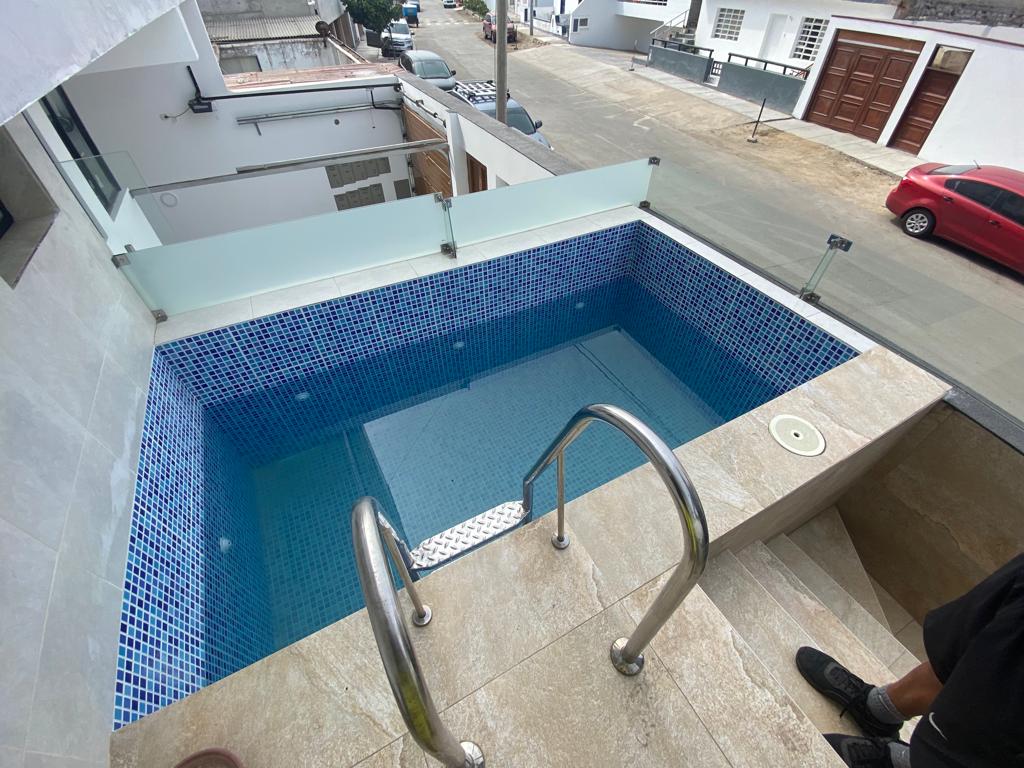 Fifth-floor apartment with a beautiful panoramic view of the sea and best location in Punta Hermosa. It has a total area of 130 m2: 115 m2 indoors and a 15 m2 terrace with a grill. There is a heated pool 1.4x1.9 mts. 4 bedrooms & 3 full bathrooms. It has a fully equipped gas kitchen with a microwave, electric oven, 450-liter refrigerator, and complete kitchenware and dining area for up to 10 people. 2 mobile desks, a spacious dining area, and high-speed WiFi available.
