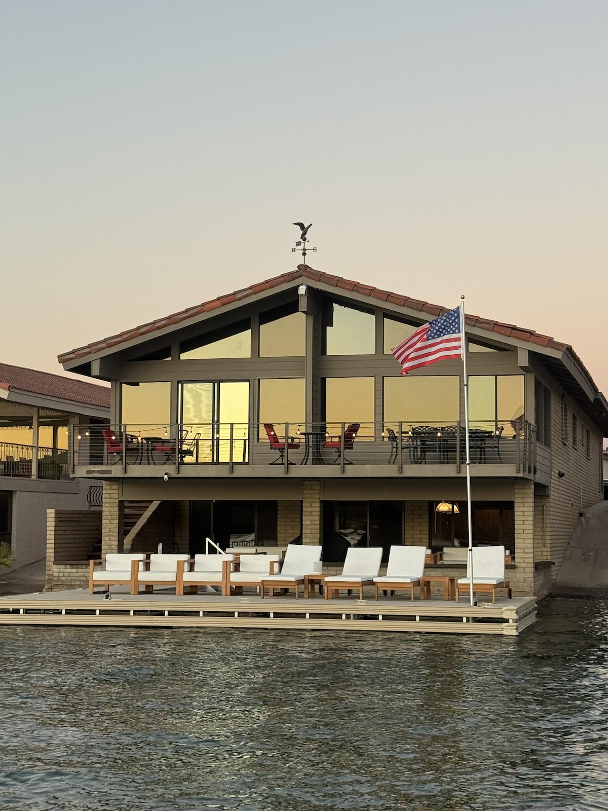 House is in Moovalya Keys on canals going out to the Parker Strip section of the Colorado River. Lijepo se nalazi nedaleko od glavnog kanala i pruža jednostavan pristup rijeci. Kanali su 5 milja na sat, što omogućava siguran vez, plivanje ili plutanje na splavovima. Kuća ima privatno pristanište od 50'ispred terase. Okrenut prema istoku pružajući mu popodnevnu hladovinu tokom najtoplijeg dijela dana, ali ljubitelji sunca i dalje mogu imati sunce na gornjoj terasi. Nalazi se odmah preko kanala od moje druge kuće The Pointe ako je potrebno više prostora