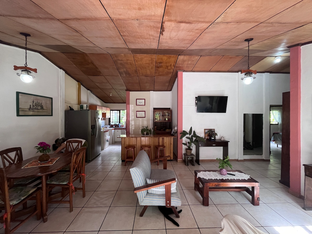 Uživajte u prekrasnom zalasku sunca na plaži Porodični smještaj u udobnom domu za odmor i izlazak iz rutine. Ranč ima 2 spavaće sobe opremljene klima uređajem, kuhinju-blagovaonicu s osnovnim priborom, unutra je kupatilo s WC-om Zajednički prostor: Bazen, 2 tuša vani, zelene površine, veliko parking mjesto, cosibo s visećim ležaljkama i kuhinja vani za pravljenje asada. Nalazimo se pored plaže, samo 2 minute hoda niz ulicu zajednice.