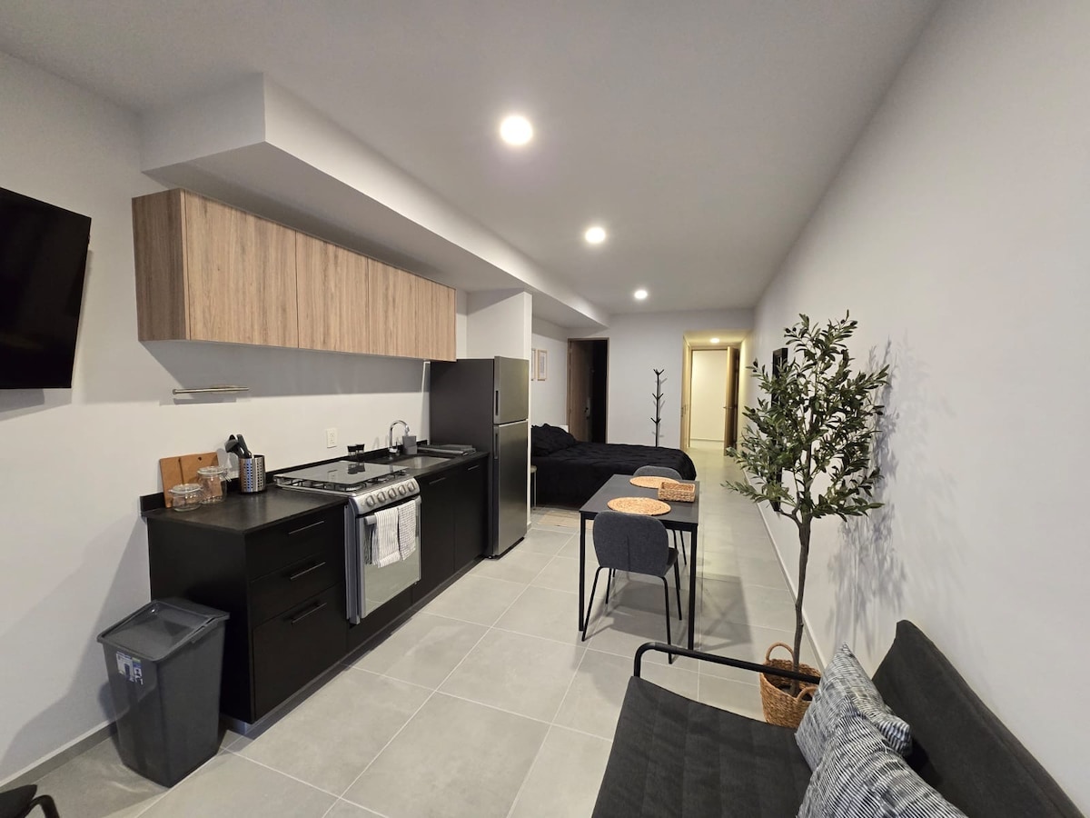 Moderan jednosoban stan s klima-uređajem u srcu Guadalajare. Uživajte u dnevnom boravku, trpezariji i privatnoj terasi s pogledom na katedralu, idealnoj za opuštanje. Nalazi se u zgradi sa obezbjeđenjem 0-24, teretanom, zajedničkom radnom sobom, 2. zajedničkom terasom i igraonicom. Savršeno za putnike koji traže udobnost, lokaciju i privatnost u jednom od centralnih i povezanijih dijelova grada. Idealno za kraće ili duže boravke. 23 km od stadiona Akron