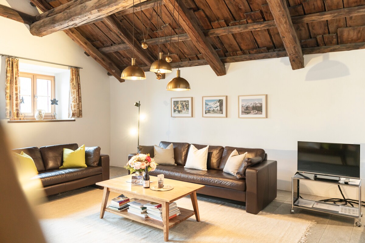 Die Chesa Michel von 1786 ist ein denkmalgeschütztes Engadinerhaus im Dorfkern von Bever. Die grosszügige 3½-Zimmer-Dachmaisonette-Wohnung Muragl (117 m²) bietet Platz für bis zu 6 Personen. Wohnküche mit Gewölbedecke, Wohnzimmer mit Cheminée, Engadinerstube, offene Galerie und zwei Badezimmer verbinden historischen Charme mit Komfort. Bodenheizung, schnelles WLAN, Parkplätze verfügbar, gute ÖV-Anbindung.