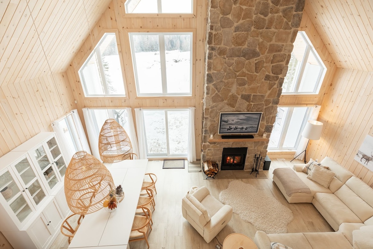 Le Chardonnay – skandinavska planinska kuća s privatnim spa centrom u Chertseyju. Uživajte u zimi između skijališta Montcalm, hodanja po snijegu u šumi Ouareau i sankanja pasa. Opustite se u vanjskoj masažnoj kadi na snijegu, oko ognjišta ili u udobnosti svijetle i tople planinske kuće, savršene za porodice, prijatelje ili rad na daljinu manje od sat vremena od Montreala. ❄️✨