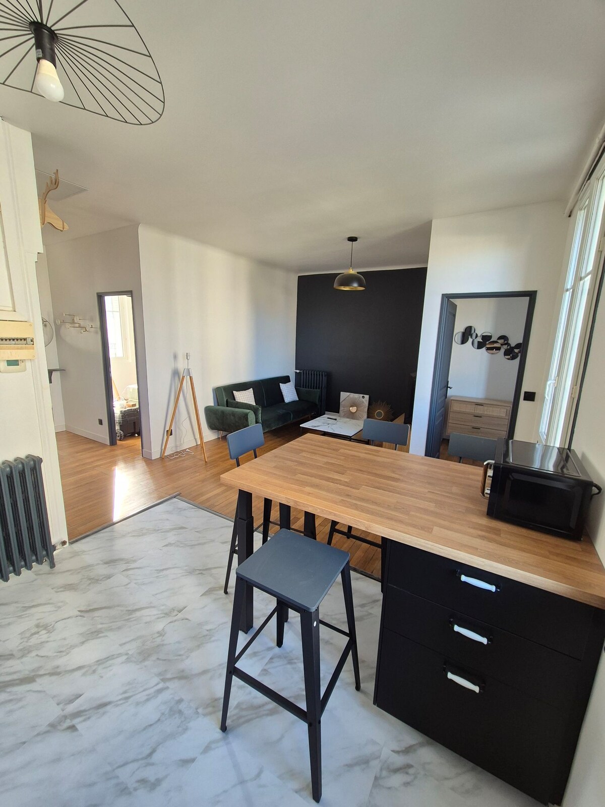 Très joli appartement de 60m2, entièrement rénové avec goût. Cuisine équipée ouvert sur salon avec canapé et télévision Samsung 50 pouces et fibre. 1 chambre avec un lit grand lit 160 et la 2eme avec un canapé lit banquette pour 2 personnes. Située au 2ème étage d'une petite copropriété calme, à seulement 50m de l'arrêt de tramway 🚋 et de nombreux petits commerces à proximité immédiate. Stationnement gratuit dans la rue. Linge de maison et ménage inclus