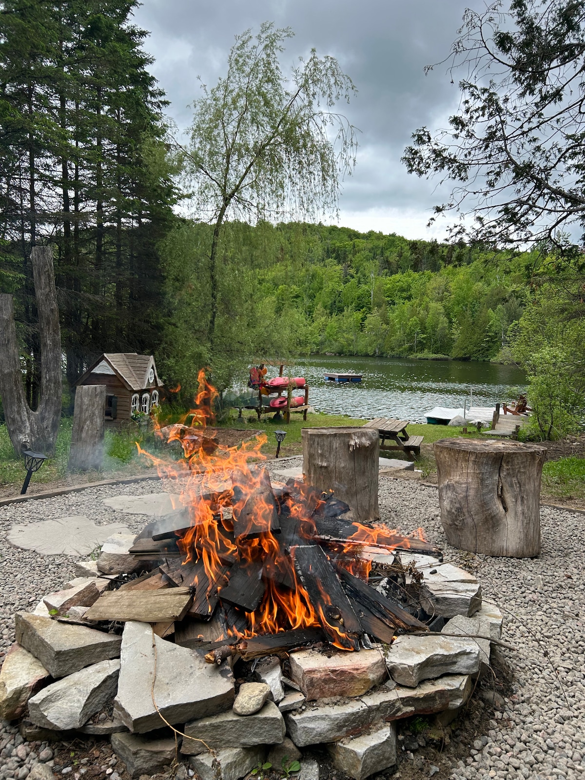 Mala rustikalna planinska kuća direktno na jezeru s tako sjajnom atmosferom! Samo 1h15 minuta od Montreala, ovo je vaše skrovište od gradskog stresa. Happy hour na privatnom pristaništu je sve što vam je potrebno da se isključite. Napomena opreza, možda ćete se zaljubiti u šarmantnog Beaulaca! Seoska kućica je mala i rustikalna, ali prilično simpatična, s prekrasnim pogledom na obalu, kao i obilnim i energičnim vrtom koji pruža privatnost komšija. Jezero je čisto, često testirano i savršeno za plivanje!