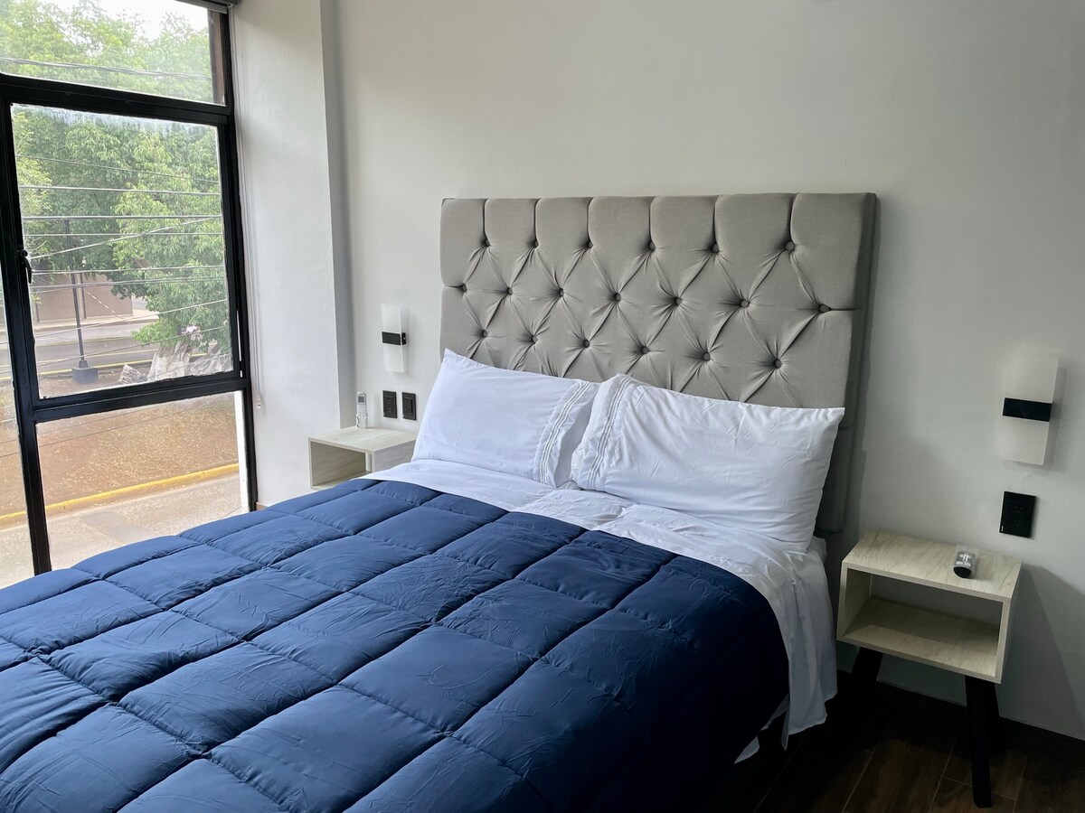 Hospédese con la confianza de AR SUITES, símbolo de excelencia y hospitalidad en Zamora. Este amplio y elegantemente departamento ofrece el equilibrio perfecto entre confort y estilo. Disfrute de un descanso incomparable con colchones, almohadas y sábanas de alta calidad, y mantenga la temperatura ideal con aire acondicionado. Ubicado muy cerca del Santuario, sobre La Calzada, la avenida más bonita, segura y con mayor comercio, podrá moverse caminando a todos sus destinos. (Sí facturamos.)