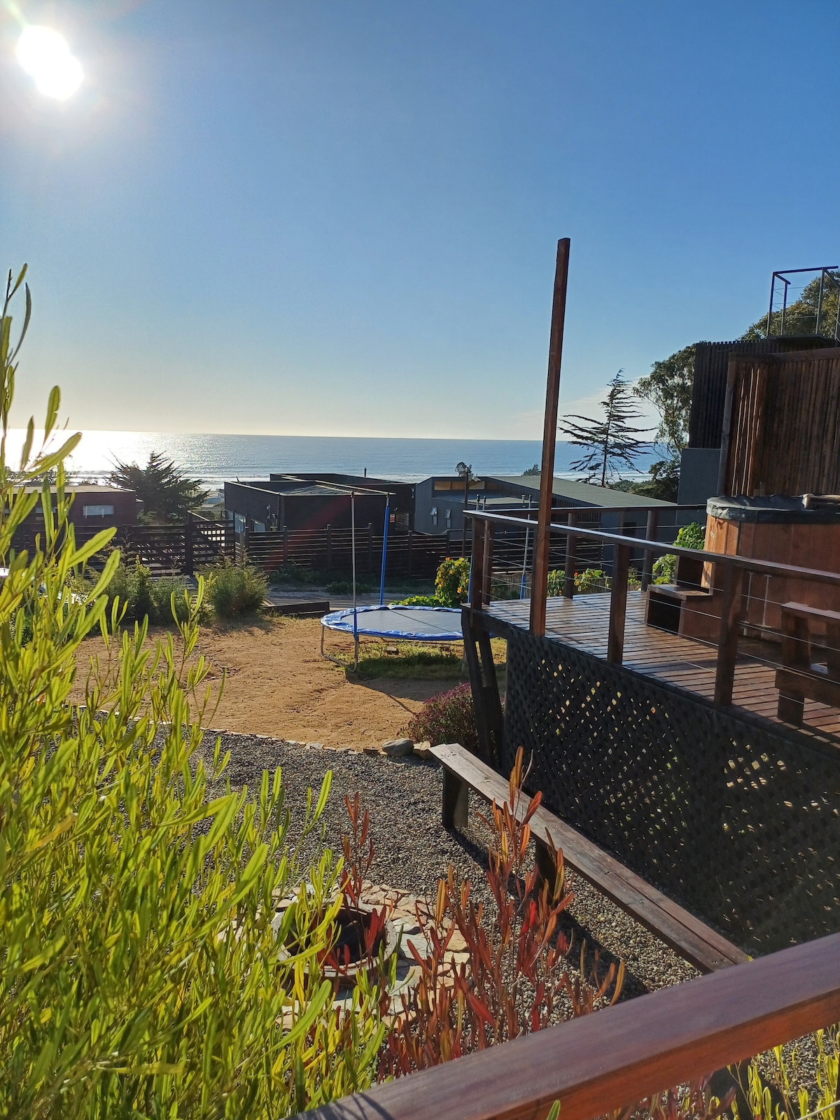Casa Maqui Pichilemu: Ecological Refuge with Spectacular Views. Between Pichilemu and Cahuil, in an ecological reserve, with sea views and magical sunsets. Design: Fine finishes, double-pane windows, spacious living room, and open kitchen. Heating: Pellet stove. Outdoor: Terrace with table, hammock, grill, and fire pit. Capacity: For 6 people. Privacy: Two independent houses. Nature: Beautiful trail in the reserve. Car recommended for arrival.