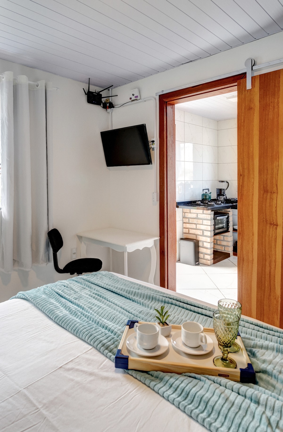 JEDNOSTAVNOST, toplina i tišina. Vrata, prozori i balkon s kadom, visećom ležaljkom i ležaljkom, okrenuti prema moru i planinama. U Praia do Garcia, mirnom, jednostavnom, malo poznatom stambenom području Floripa, s malom i bukolnom zaštićenom plažom, između Praia da Tapera, tradicionalne zajednice ribara i gastronomske rute Ribeirão da Ilha. Udaljenosti automobilom (preporučeno): Aerodrom u trajanju od 11 minuta 10 min Ribeirão 22 min do centra grada 20 minuta do plaže Campeche