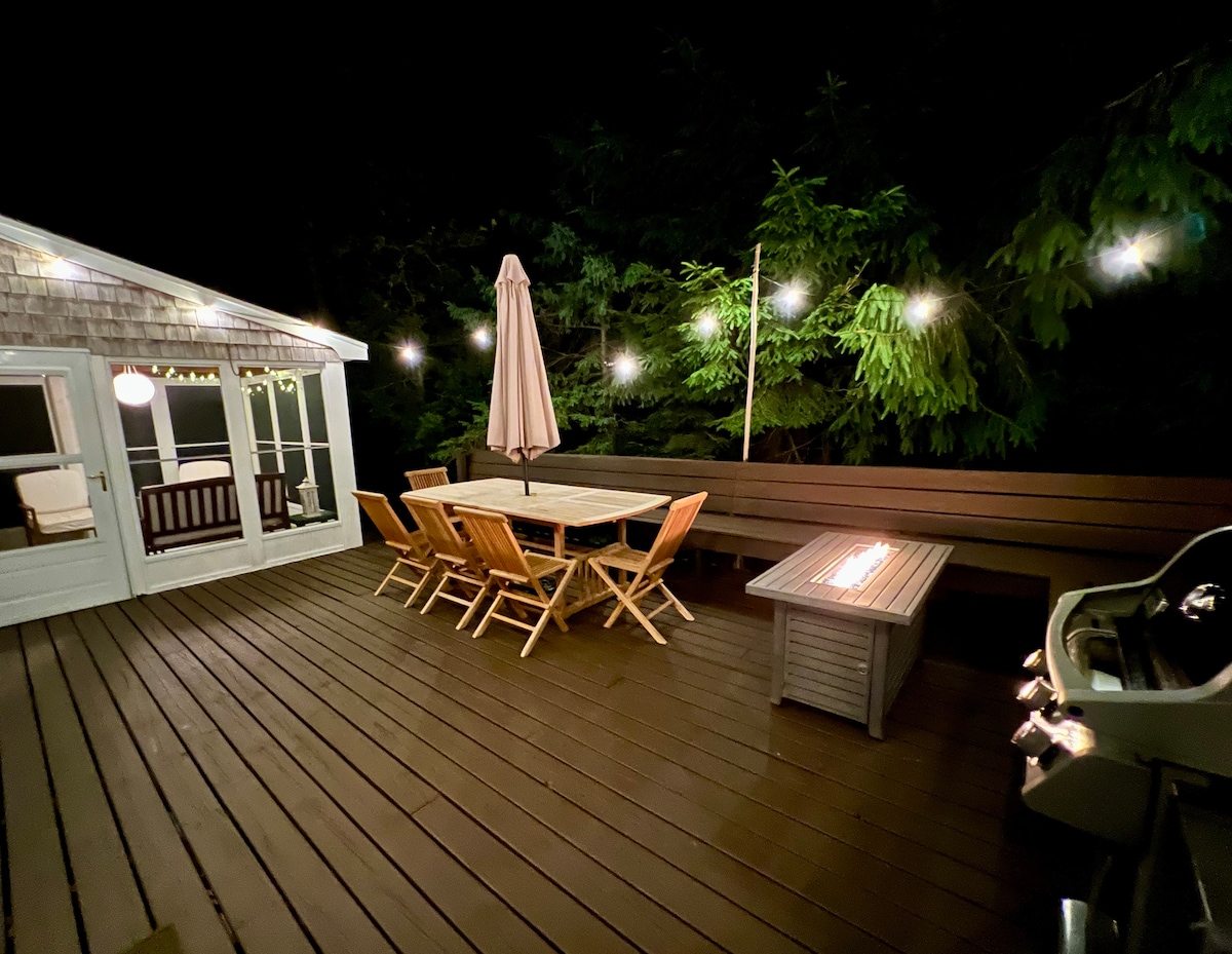 Obožavam ovaj kvart! Mirno je, mirno i samo nekoliko minuta hoda do plaže Tashmoo ili centra Vineyard Havena i trajekta. Kuća ima dosta vanjskog prostora sa vlastitom peći za pizzu na drva, ognjištem i terasama. U blizini ognjišta, na donjoj palubi i na gornjoj palubi nalaze se lijepi prostori za sjedenje. Prošetajte kroz dvorište, niz makadamski put i za pet minuta ćete biti na vodi. Peškiri za plažu su uključeni! Mnogo kliznih staklenih vrata i PUNO svjetla. Vitamix je uključen!