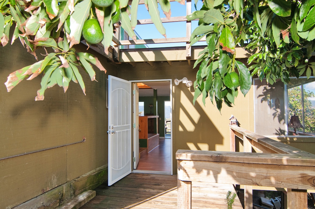 Treba li vam bijeg od kuće? Naša neobična jednosobna studio kućica nalazi se u našem šumarku avokada s prekrasnim pogledom u brdima De Luza. Ima bračni krevet, 3/4 kupatilo, čajnu kuhinju s frižiderom i štednjakom (ali bez rerne), roštilj na plin, trpezariju i privatnu terasu za dvije osobe. Seoska kućica ima vlastiti ulaz i prilaz odmah pored glavnog prilaza. Dok se opuštate na terasi ili iz kuće, uživat ćete u panoramskom pogledu i jezeru. Udobna seoska kućica ima oko 700 kvadratnih metara i nalazi se pored našeg doma u sklopu objekta. Imamo „prirodnu klimu” (tj. nema klima-uređaja, ali ima ventilatora i mnogo prozora). Uključeni su i TV sa satelitskom televizijom i Wi-Fi mrežom te kontinentalni doručak koji se obično sastoji od hljeba za tost, voća, kafe i čaja. Seoska kućica je odlična destinacija za odmor „bijeg od svega”, za planinare i bicikliste i motocikliste koji žele uživati u zabačenim seoskim cestama i vizurama. Uživat ćete u prekrasnoj vožnji do naše seoske kućice s vjetrovitim, uskim cestama s drvoredima. Tržnica Temecula je popularna destinacija subotom, a Temecula ima fantastičan izbor vinarije za degustacije i objedovanje. U Fallbrooku se nalaze razni odlični restorani, simpatične prodavnice, uključujući retro prodavnicu slatkiša, kao i popularna umjetnička galerija. Nalazimo se u blizini staze rijeke Santa Margarita koja je staza dugačka 6 milja koja se nalazi u blizini Fallbrooka u Kaliforniji i ima rijeku i dobra je za sve nivoe vještina. Staza se koristi za planinarenje, brdski biciklizam i jahanje konja. Pristupačno je tokom cijele godine. Plato Santa Rosa je još jedno fantastično mjesto za planinarenje, s proljetnim bazenima i prekrasnim valovitim brdima i panoramskim pogledom. Udaljeni smo 7,5 milja (15 minuta) od Fallbrooka i 25 minuta od Temecule i 45 - 50 minuta od Oceansidea. Osim toga, udaljeni smo i oko 1 sat od centra San Diega i aerodroma SD. Samo za vašu informaciju, udaljeni smo 15 minuta od najbliže prodavnice u Fallbrooku, a putevi do ovdje, kao što je ranije spomenuto, su vjetroviti, ali lijepi. Imamo i 2 slatke unutrašnje/vanjske mace koje bi mogle navratiti u posjetu, ali ih ne dozvoljavamo u gostinjskoj kući. Samo da napomenemo, život u ruralnom području dijelimo naš posjed s lokalnim životinjama koje prolaze, kao što su kojoti, rakuni itd. U dodacima krznenih stvorenja, imamo i vrstu insekata. Trudimo se da ne koristimo pesticide kako biste s vremena na vrijeme mogli vidjeti programsku grešku. Moguć je sedmični najam.