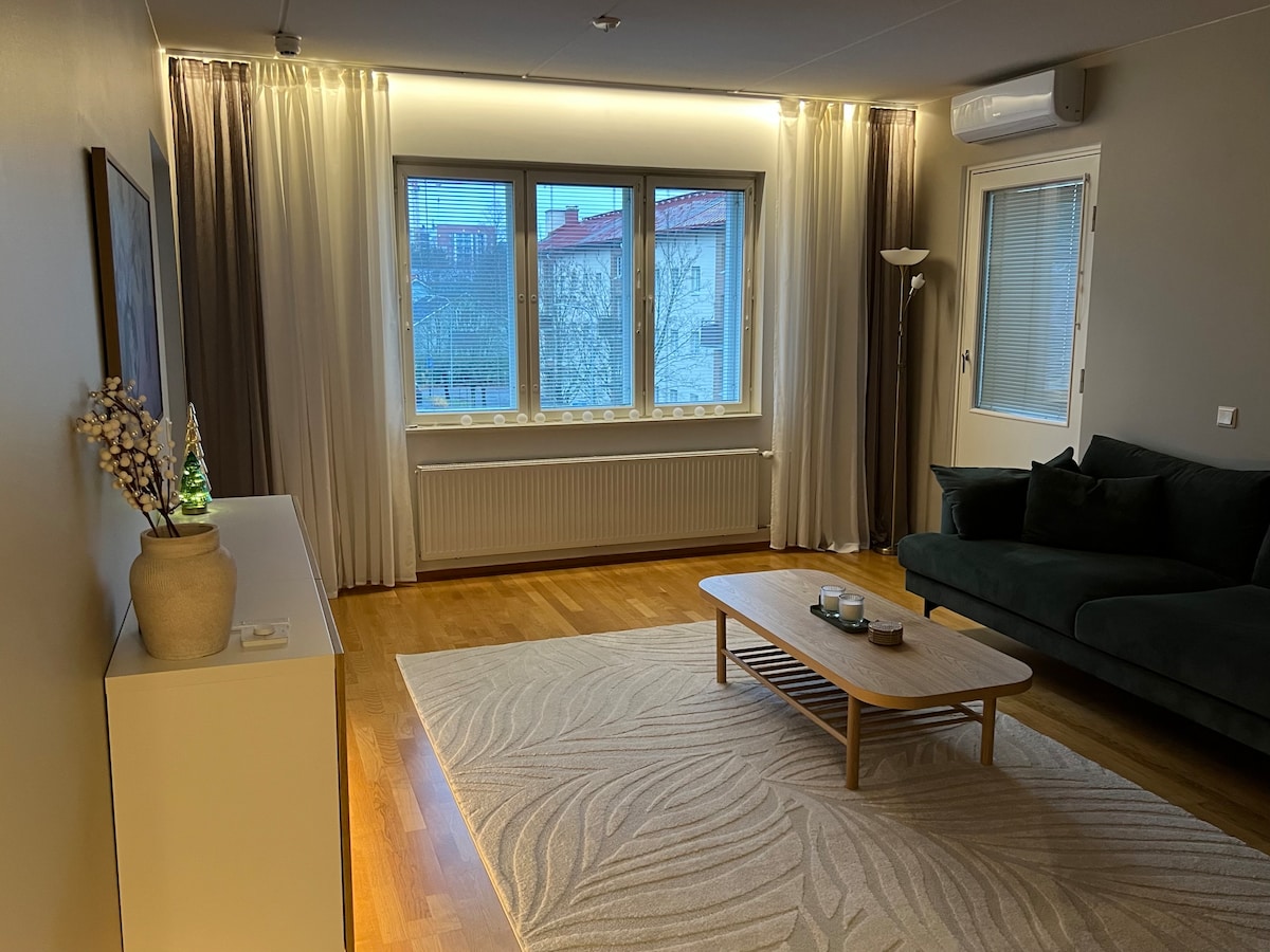 Čist, dobro opremljen i prostran (61 m2) stan s vlastitom saunom i ostakljenom terasom u kulturnoj četvrti. Dobar WI-FI i pametni TV. Namjensko parking mjesto u toploj garaži s pristupom liftu. Mirna kuća i dobro igralište u dvorištu kuće. Odmah pored su Muzej vizuelne umjetnosti Malva i restorani Malskin Bistro, Kahiwa i Ant Brew. Pješačka udaljenost do tržnice, pozorišta, kuće Sibelius, trgovačkih centara Trio i Syke, luke, sajma i sportskog stadiona.