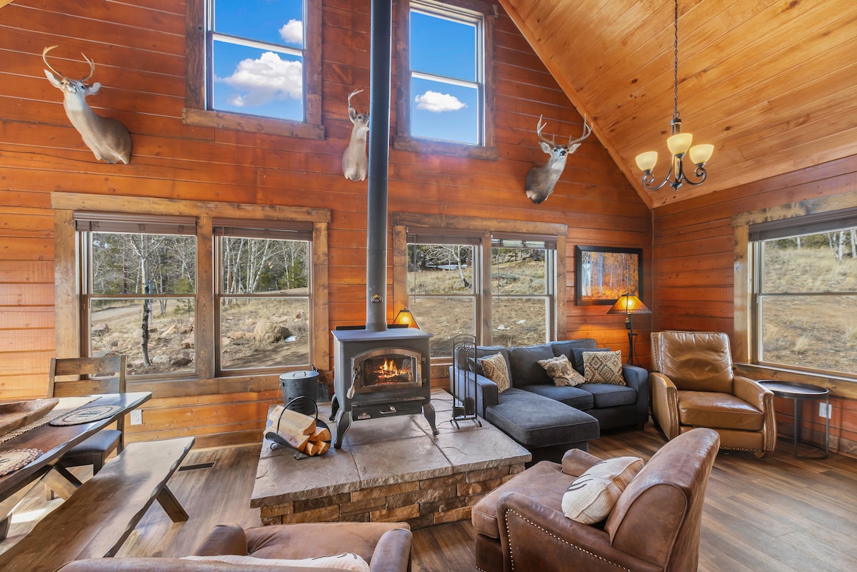 Dobro došli u našu rustikalnu brvnaru u prekrasnom Florissantu u Coloradu. Uživajte u prostranom zemljištu s drvećem i jednostavnim pristupom Florissant Fossil Beds, kanjonu Eleven Mile i gradu Cripple Creek. Ostanite povezani putem satelitskog interneta ili se isključite i uživajte u hladnom zraku na visokoj nadmorskoj visini i prekrasnom pogledu na planine. Pijuckajte svoje omiljeno piće pored vanjskog ognjišta dok se divite zalasku sunca koji oduzima dah i koji se pretvara u nevjerovatno zvjezdano nebo ili se udobno smjestite unutra pored toplog kamina.