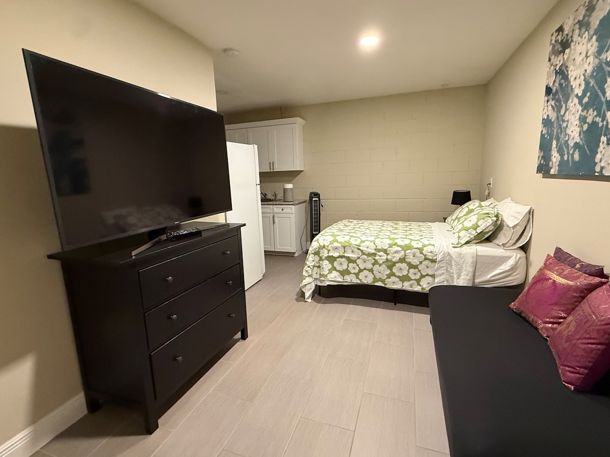 No shared areas. This apartment is located in a separate area of the house with a private entrance. It has 1 bedroom with a queen size bed, 55” smart tv, dresser, closet, and 2 nightstands. The den contains a 50” smart tv, sink, microwave, table and 2 chairs, cooktop, small refrigerator/freezer, “L” shaped sofa. The bathroom has double vanity sink, shower, tub, linen closet and body soap dispenser. Wifi, Netflix, Amazon Prime, HBO Max included. Queen air mattress available. Private back patio