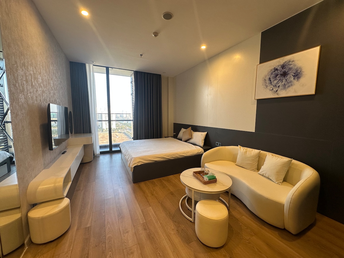 The apartment is located in Halong Marina, Bai Chay area—just steps from the beach and close to cruise ports for Ha Long Bay tours. Please note it is about 5 km from Bai Chay Tourist Center and 12 km from Ha Long City center, offering a quieter stay away from busy areas. The studio features a king bed, sofa bed, full kitchen, washing machine, and modern bathroom. Guests can enjoy an infinity pool, jacuzzi, gym, spa, and parking (extra fee).