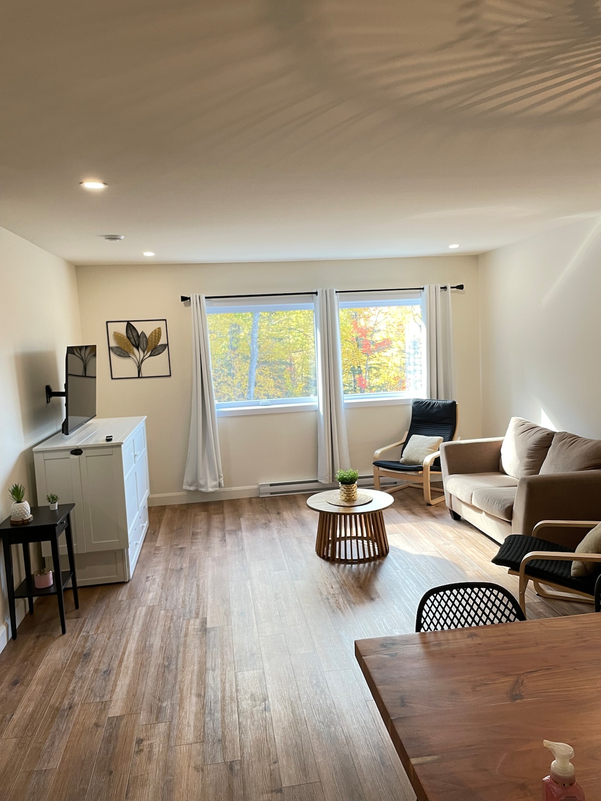 Vrlo prostran stan s predivnim pogledom na veličanstvenu rijeku Saguenay. Jedna od dvije spavaće sobe ima bračni krevet, druga ima dva bračna kreveta, a dnevni boravak uključuje kauč na razvlačenje za dodatne goste. Ovaj smještaj je idealan za ugošćavanje dva para i dodatnog gosta. Praktično smješten u blizini centra Chicoutimija i samo 2 minute hoda od trgovine namirnicama.