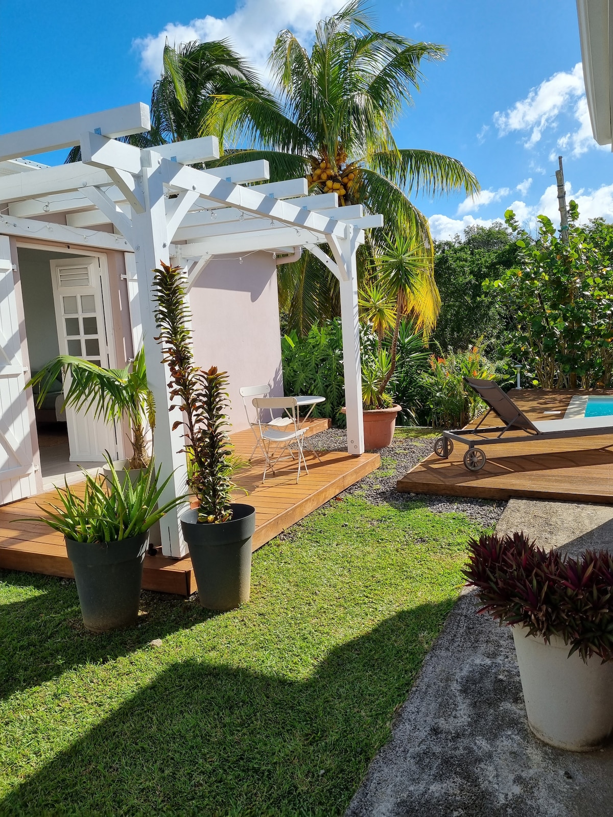 Uživajte u elegantnom i centralnom smještaju u šarmantnoj zelenoj rezidenciji. U blizini glavnih puteva: 10 minuta od aerodroma i glavnog grada Fort de France; 5 minuta od tržnog centra La Galleria i CHU. Dobro se nalazi u centru ostrva, što olakšava pristup sjeveru i jugu.