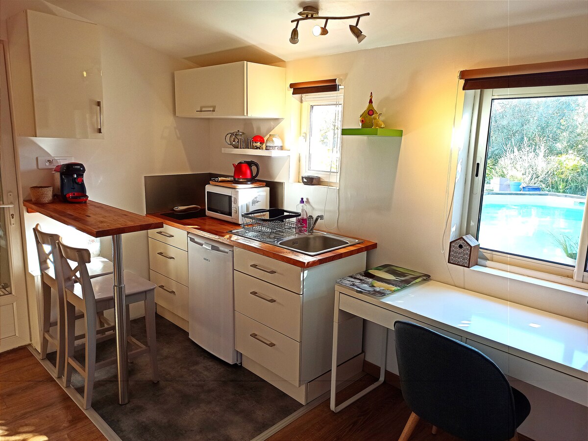 Šarmantni studio, vrlo svijetao s pogledom na bazen i njegove drvene terase. Da ne spominjemo masažnu kadu/spa za vaše dobrobit i opuštanje. Naći ćete svu udobnost koja vam je potrebna za nezaboravan boravak u Provansi. Potpuno opremljen .. reverzibilni klima uređaj i TV. Idealno smješten, manje od dva kilometra od centra grada, pružit će vam mir i opuštanje. (Masažna kada je otvorena od 1. aprila do 31. oktobra, a bazen od 1. maja do 1. oktobra).