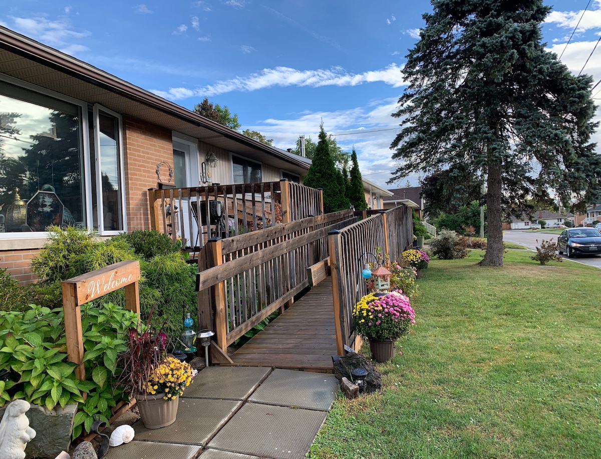 Miran bungalov s prilagođenim pristupom za invalidska kolica, smještaj s 3 spavaće sobe nalazi se u slijepoj ulici s parkingom . Gosti mogu u potpunosti koristiti glavni sprat s podrumom samo za upotrebu vlasnika. Smješten u centru grada za restorane, kupovinu nedaleko od autoputa 401 i jednostavno putovanje do jezera i lokalnih atrakcija . Pješačka udaljenost do parkova , najbliže plaže i rijeke St. Lawrence. Ako dolazite u nedjelju između 1. maja i 1. oktobra, imajte na umu da je vrijeme dolaska nakon 19:00 sati.
