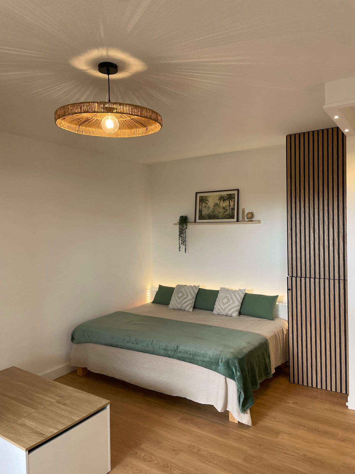 Coconfort is a bright and elegant apartment in a lush green setting. 27 m² (290 sq ft) fully renovated: - Separate, fitted kitchen. - Dedicated sleeping area with storage and a small office, elegantly separated from the living area, which benefits from a terrace overlooking the residence's grounds. - Bathroom with toilet, shower, and washing machine. Bed made, one towel provided. This quiet ground-floor apartment does not overlook the street. Easy and direct access with secure private parking.
