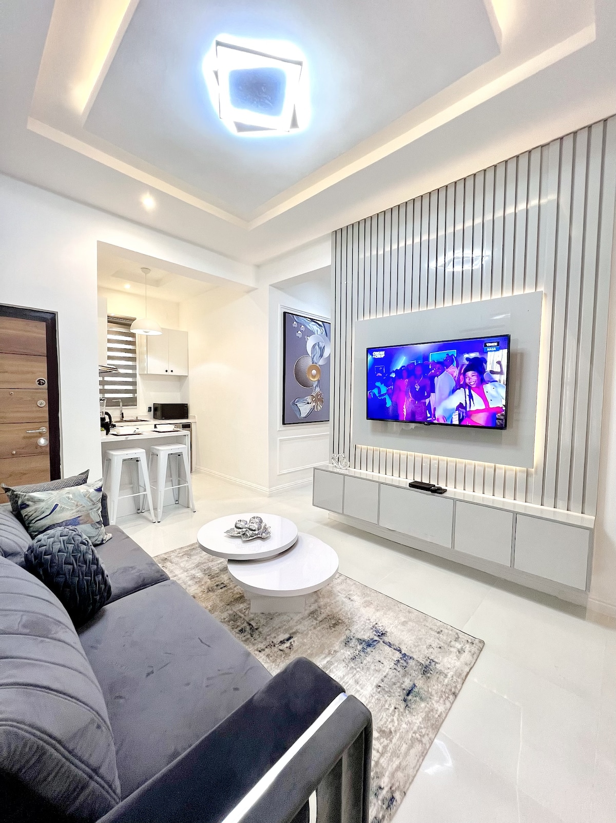 Opustite se u ovom elegantnom jednosobnom i salonu u Lekkiju, 1. faza. Uživajte u svjetlu, Wi-Fi mreži, DSTV-u, Netflixu (prijavite se sa svojim korisničkim računom) i besplatnom čišćenju svaka 3 dana. Smješten u mirnom i sigurnom području, udaljen je samo 5 minuta hoda do kina Imax, bolnice Evercare, koledža Dowen, banaka, restorana, klubova i restorana u selu 0-24. Do mosta Lekki-Ikoyi Link i kapije Lekki Ph 1 ima manje od 5 minuta vožnje. Pregledajte naše druge oglase i PROČITAJTE sve ostale informacije prije rezervisanja.