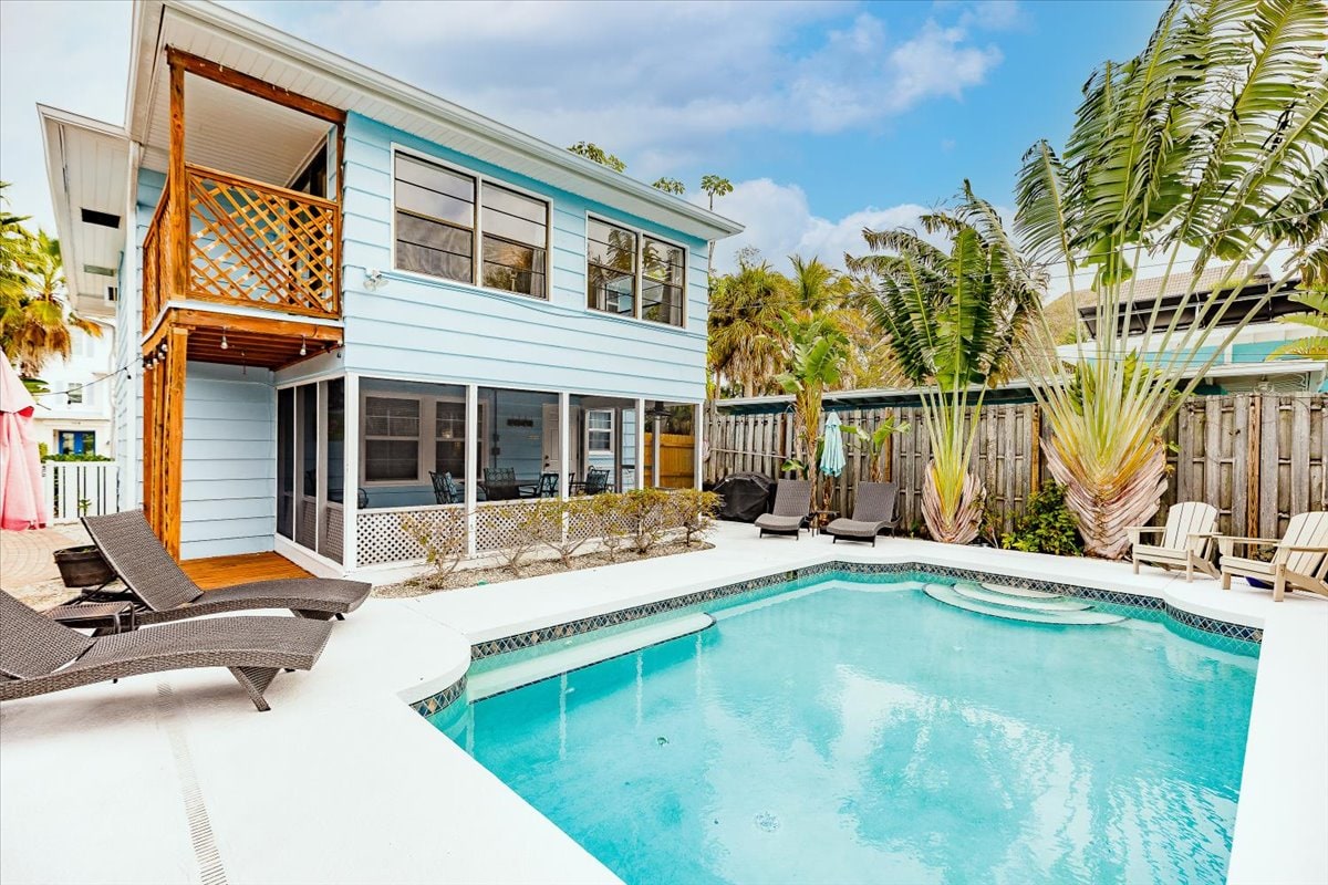 Smještena u mirnoj ulici Crescent, ova klasična seoska kućica iz 1969. godine, udaljena je samo nekoliko minuta hoda do podzemnog kvarcnog pijeska u četvrti Siesta Key. Privatni finišer od 150 kvadratnih metara i kameno dvorište s ekrana u Lanaiju u potpunosti su ograđeni s prilagođenom vanjskom kuhinjom od nehrđajućeg čelika, s velikim roštiljem, frižiderom i kamenim barom izrađenim po mjeri s prostorom za sjedenje za 8 osoba . U blizini se nalazi plavi stakleni plinski ognjište s prostorom za sjedenje, preko veličine (promjera 9 stopa) u prizemlju „kalem”, ležaljkama i velikim kružnim dnevnim krevetima.