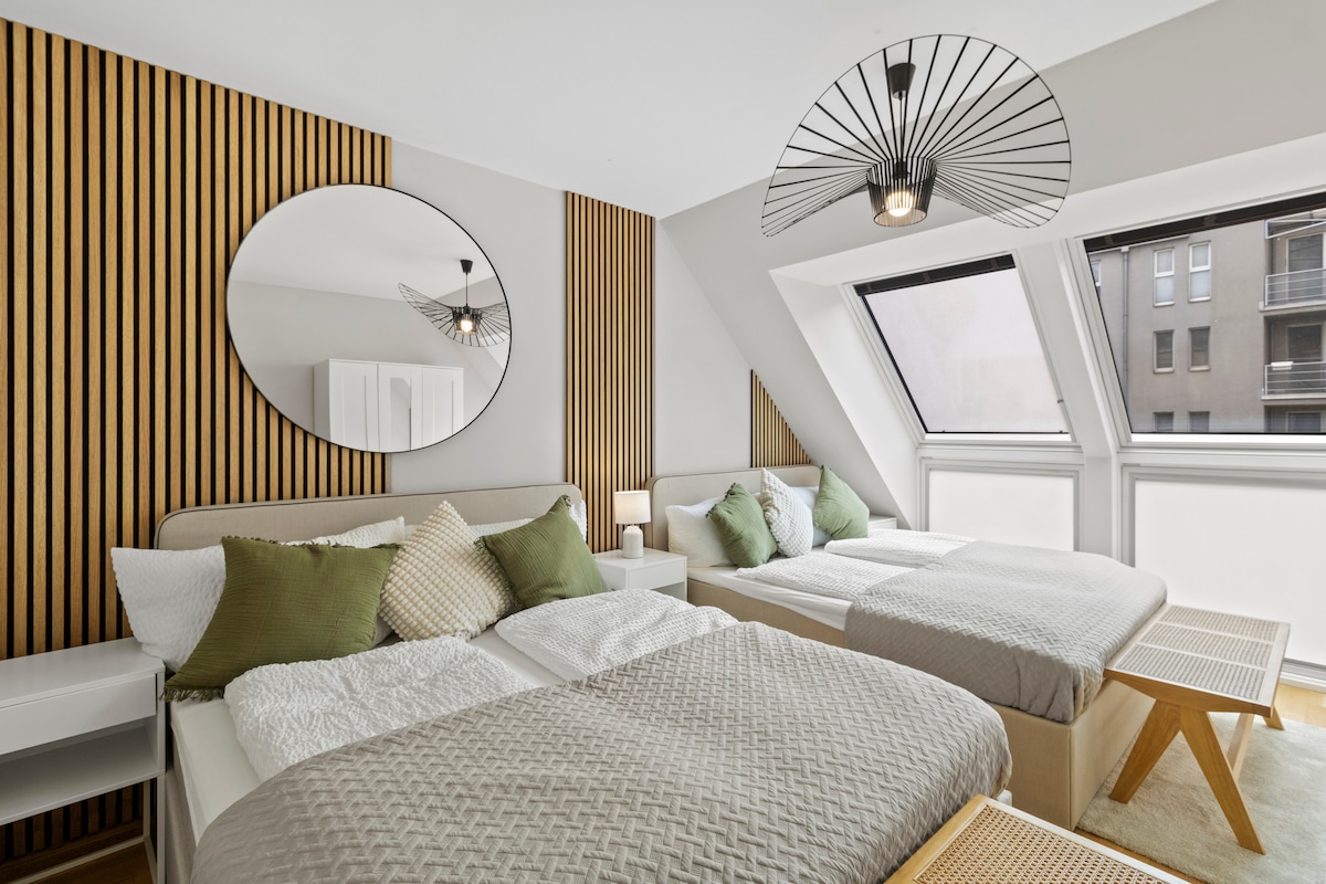 Dobro došli u svoj elegantni stan u prvom stanu u blizini Starog Dunava! Svijetli tavan s visokokvalitetnom opremom: namještaj od masivnog drveta, Sofitel madrac (160x200cm), tuš kabina, podno grijanje, klima uređaj i sunčana terasa. Potpuno opremljena kuhinja s potpuno automatskim aparatom za kafu, zasebnom spavaćom sobom i radnom sobom s brzim Wi-Fi mrežom nude maksimalnu udobnost. Samo 5 minuta hoda do U1 Kagraner Platza – Stephansplatz za 15 minuta. Za 2 osobe, bez kućnih ljubimaca.