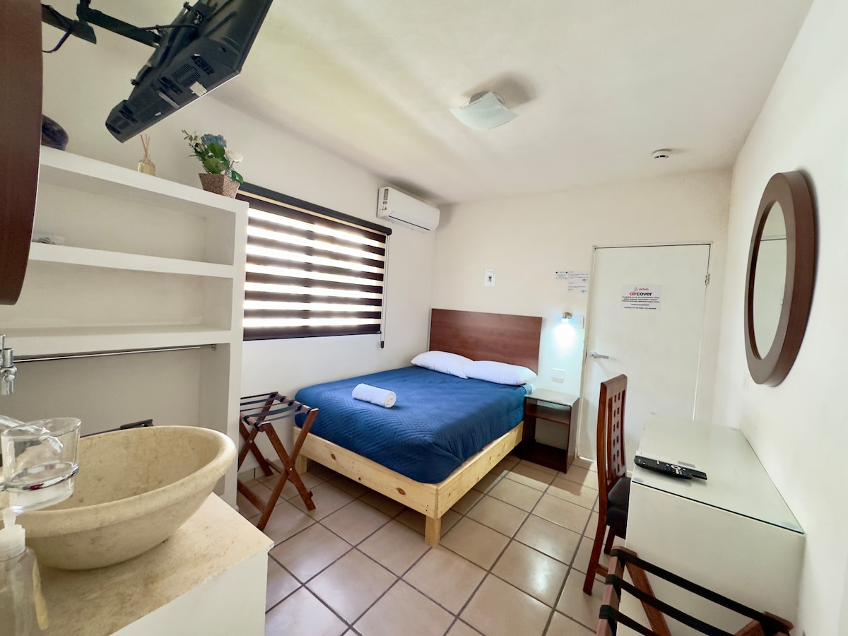 Habitación Ejecutiva Privada. Descanse como se merece, a un precio que sí conviene ✨. 🛏️ 1 cama matrimonial, baño en la habitación, ropa de cama premium, TV, Wi-Fi y frigobar. ❄️ Minisplit para un ambiente agradable. 🍳 Cocina compartida totalmente equipada. 🌿 Áreas verdes. 🚗 Estacionamiento con cámaras. 🔐 Self check-in/out con cerraduras digitales. ☕ Snacks disponibles. 🧺 Lavandería equipada. 📍 Frente a parque, cerca de zona industrial y vías rápidas. ✅ Qynd Hotel: la opción inteligente