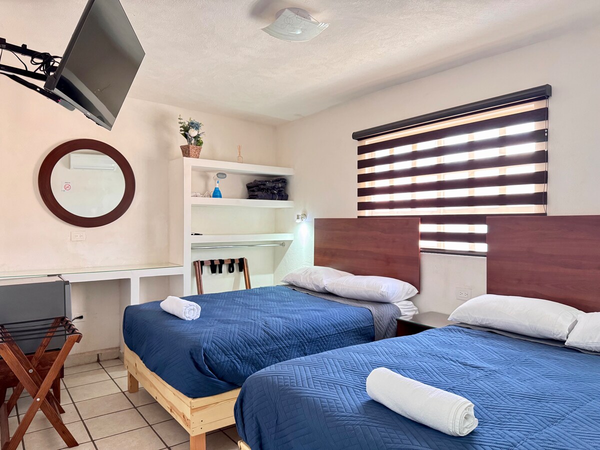 Habitación Ejecutiva Privada. Descanse como se merece, a un precio que sí conviene ✨. 🛏️ 2 camas matrimoniales, baño en la habitación, ropa de cama premium, TV, Wi-Fi y frigobar. ❄️ Minisplit para un ambiente agradable. 🍳 Cocina compartida totalmente equipada. 🌿 Áreas verdes. 🚗 Estacionamiento con cámaras. 🔐 Self check-in/out con cerraduras digitales. ☕ Snacks disponibles. 🧺 Lavandería equipada 📍 Frente a parque, cerca de zona industrial y vías rápidas. ✅ Qynd Hotel: la opción inteligente