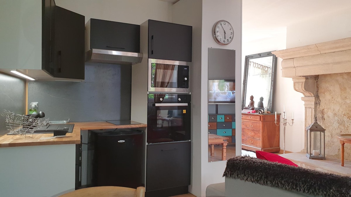 Mala klimatizovana kuća, nezavisni ulaz za spavanje 4. U blizini 50 m2, 2 spavaće sobe, 2 kreveta 160 cm, 2 kupatila, 2 kupatila, 2 WC-a, dnevni boravak sa čajnom kuhinjom, mikrovalna pećnica, frižider, mašina za pranje suđa. Brzi Wi-Fi. Terasa sa zatvorenim jugozapadnim vrtom od 23 m2 privatnog. Knjige, igre, nema TV-a. Terminal za električne automobile od 5 do 7,2 kW u zavisnosti od modela, utikač tipa 2 koji se plaća na licu mjesta. Mogućnost zatvorenog privatnog parkinga za bicikle i motocikle na zahtjev.