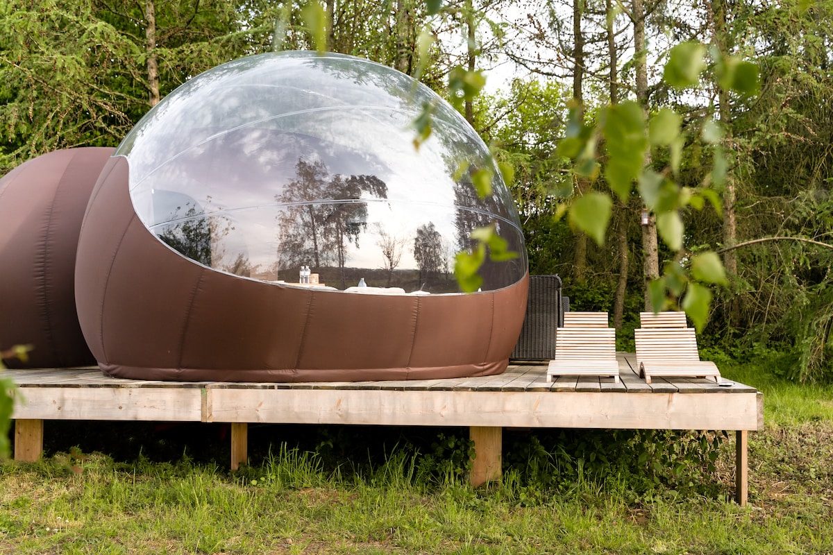 Luksuzna kupola za glamping za 2 osobe u Ardenima. Uživajte u romantičnim satima uz panoramski pogled na šumu, udoban bračni krevet, moderno kupatilo s tušem i elegantan dizajn. Udoban vanjski prostor za sjedenje poziva vas da se opustite u prirodi. Savršeno za parove koji traže glamping, doživljaj prirode, mir, udobnost i ekskluzivno vrijeme u šumi.