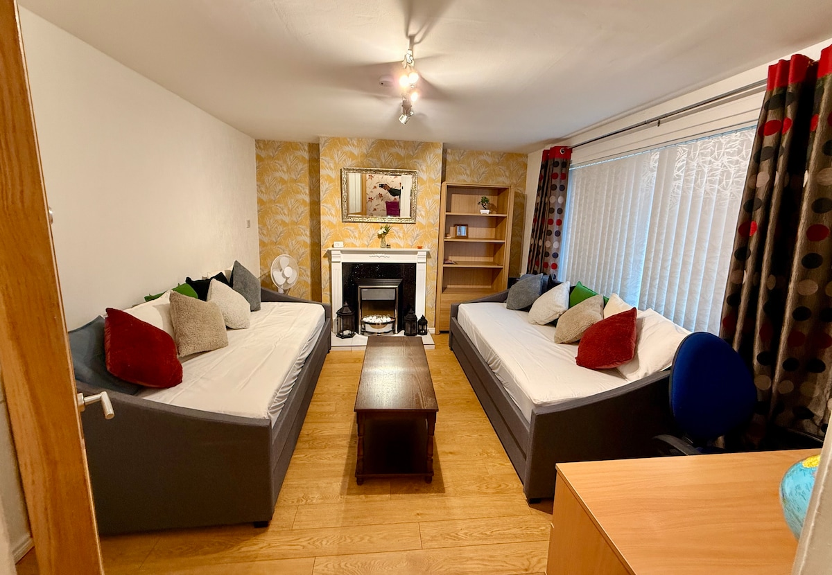 Kuća od kuće, prostrana, odvojena nekretnina smještena 30 metara iza glavne kuće, potpuno privatna. Pored terena za golf s 9 rupa, prodavnica mješovite robe, off Licence i Pizza/chip shop. Odlična autobuska linija na pragu. 2 minute do autoputa M1 10 minuta do centra grada. Kuhinja je dobro opremljena loncima, posuđem, čašama i priborom itd. So, biber, ulje, šećer od čaja/kafe su isporučeni. Kupatilo ima električni tuš, peškire, šampon/regenerator i gel za tuširanje. Spavaća soba ima bračni krevet.