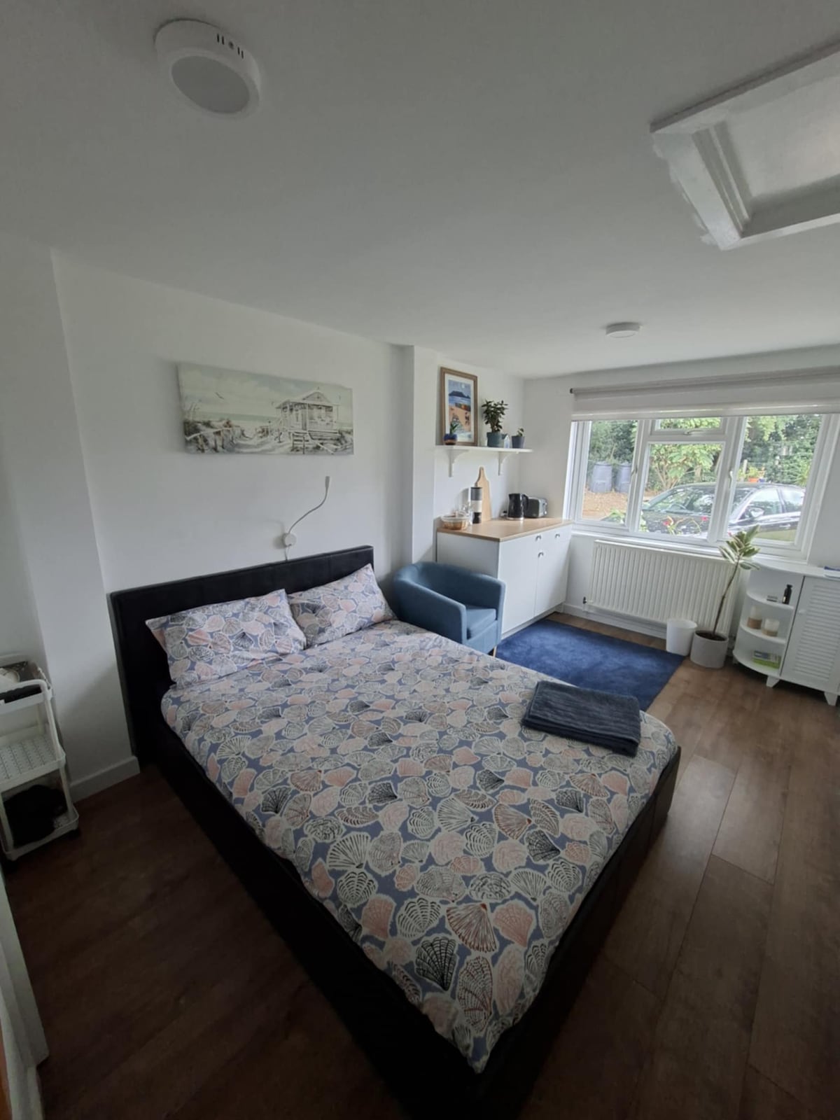 Light,self contained private room /shower in my garden. Own south facing patio and table. Comfy king bed. Very Quiet location. Easy walking distance to Poole Town Quay about 25 minutes by foot. Lively Ashley Cross with bars/pubs only 20 mins walk. B'mth beaches/ Sandbanks are just a short distance by car/bus. Parking on road after 6pm Monday - Friday. All other times -2 hour parking from 8am to 6pm. Weekends - no restrictions. I supply a basic continental breakfast, I can cater for coeliacs.