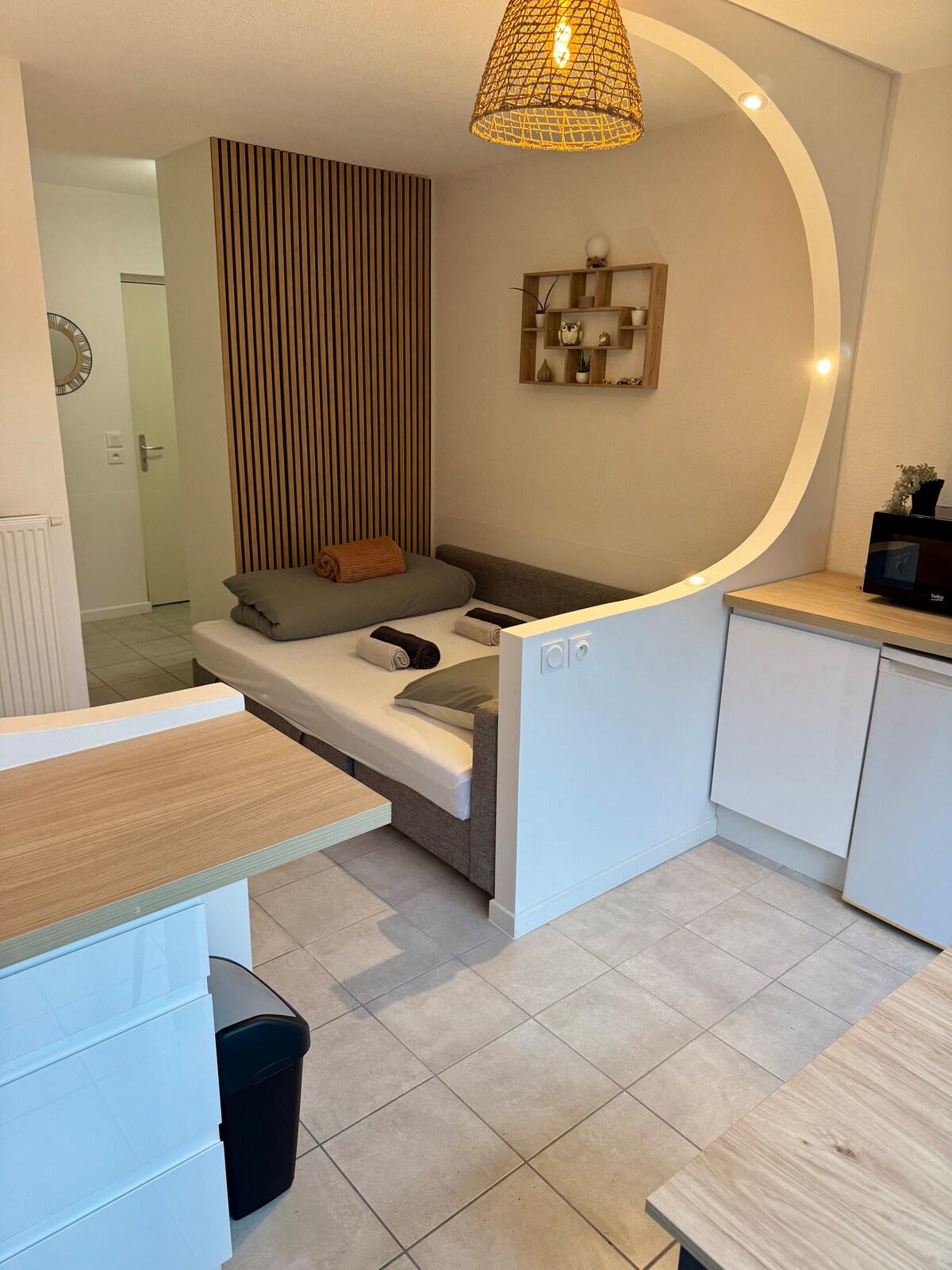 Novi, potpuno opremljeni namješteni studio. spavaća soba s bračnim krevetom, opremljena kuhinja i stol za 4 osobe. kupatilo i WC šolju. topao i moderan dekor. nalazi se na desnoj obali rijeke Garonne, 4 kilometra nizvodno od Bordeauxa, 5 minuta od tramvaja, 2 minute autobusom do centra Bordeauxa i 5 minuta od brodova koji vas vode do muzeja Cité du Vin, Miroir d'eau, centra Bordeauxa.