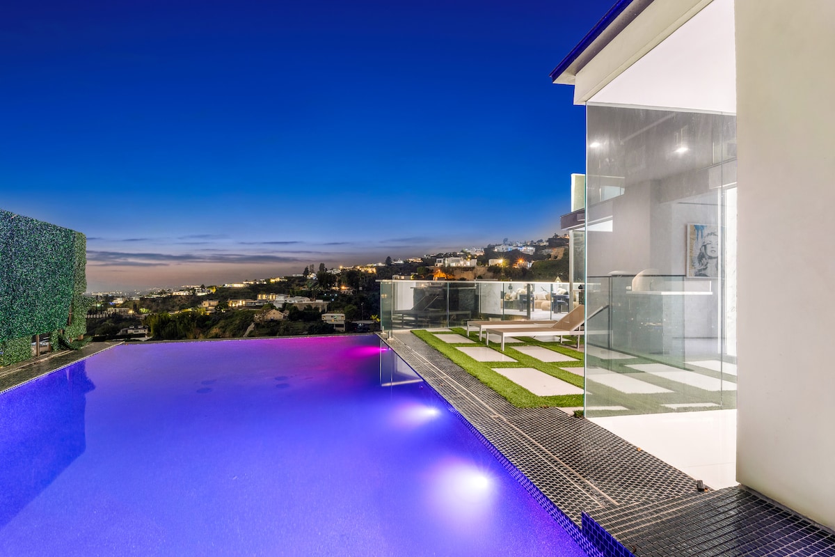 Escape to this breathtaking 4-bedroom retreat perched above the Sunset Strip, offering panoramic views from downtown to the ocean. Designed for unforgettable gatherings, the open-concept layout features soaring wood-beamed ceilings, sleek modern interiors, and seamless indoor-outdoor flow with floor-to-ceiling glass doors. Enjoy movie nights like never before with cinema-style projectors in the living room and primary suite. The gourmet kitchen and spacious dining area are perfect for group meal