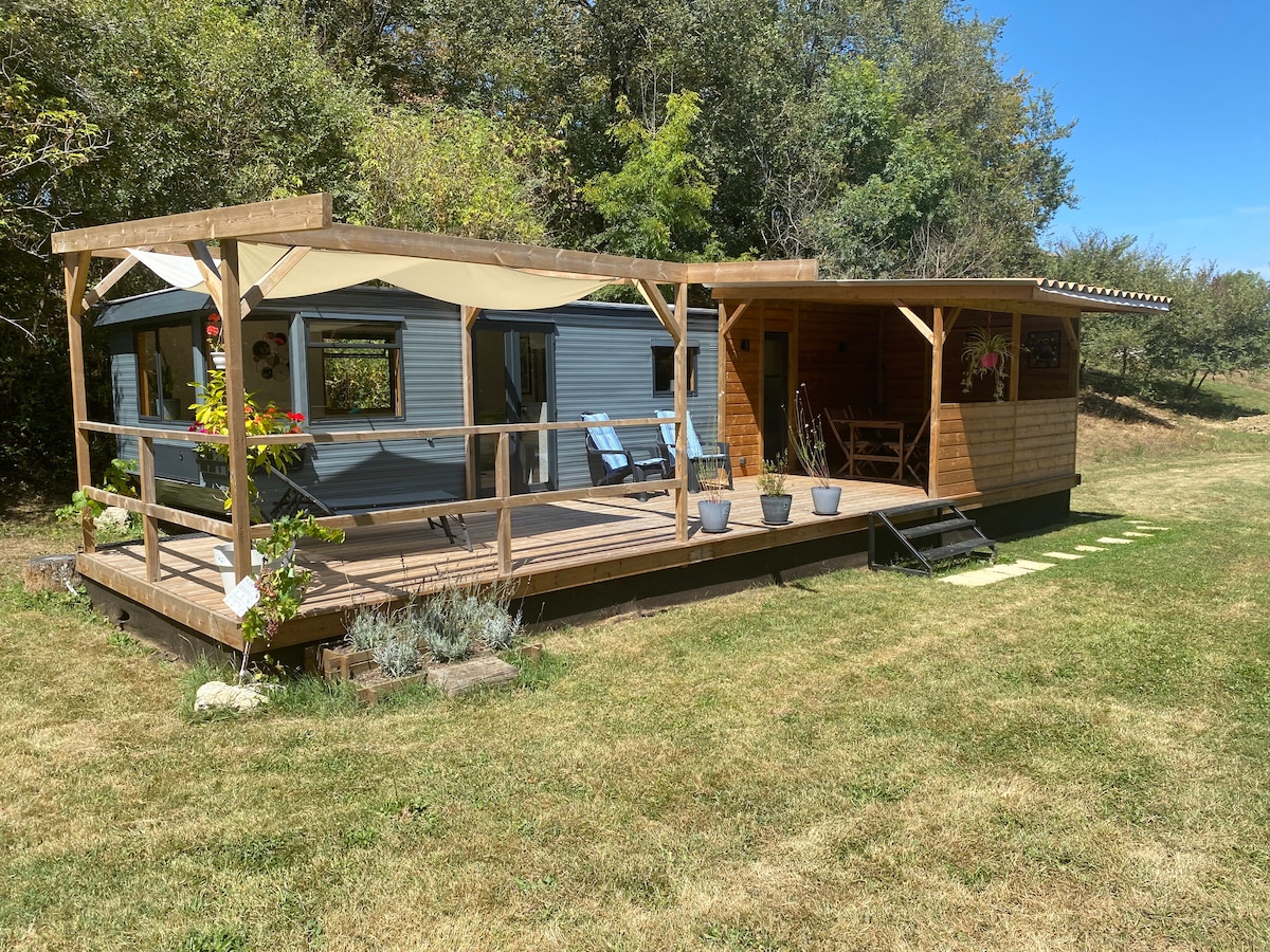 Enjoy a sunny stay in our modern private mobile home with a spacious (partly covered) terrace in the French countryside of Southwest France. Perfect for couples, peace-seekers, and walkers; a walking trail runs along our property. Featuring a comfortable double bed, private bathroom, and fully equipped kitchen with oven, gas stove, and dishwasher. Bed linen and towels included. Shared swimming pool in summer for a refreshing dip.