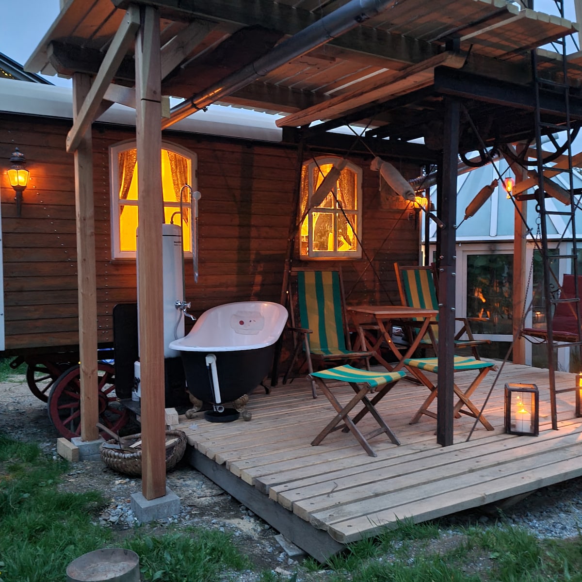 Obnovljen je 50-godišnji karavan sa 9 m2. Ima mini WC, umivaonik s vodom i 2 ploče za kuhanje, čajnik, aparat za kafu, osnovno posuđe, 2 kreveta za jednu osobu, frižider i veliki i mali sto i Wi-Fi. Kreveti imaju sljedeće dimenzije 190 cm dužine i 73 cm širine. Moguća je dodatna mogućnost spavanja za treću osobu Visina kamp prikolice 180 cm