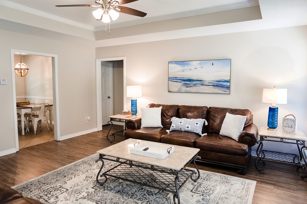 Enjoy your stay at this fully renovated 2nd floor condo close to shopping and dining. Swim in one of the pools, relax on the balcony, or walk down to the bay to enjoy the beautiful sunsets. Located in Daphne, AL 1.5 miles to I-10, backing up to Hwy98. 10 miles from Mobile and just 35 miles to the beach in Gulf Shores. This stylish condo features a king size bed in the bedroom, a Jack-and-Jill bathroom, a dedicated desk/office space, and smart TVs in both the living room and bedroom.