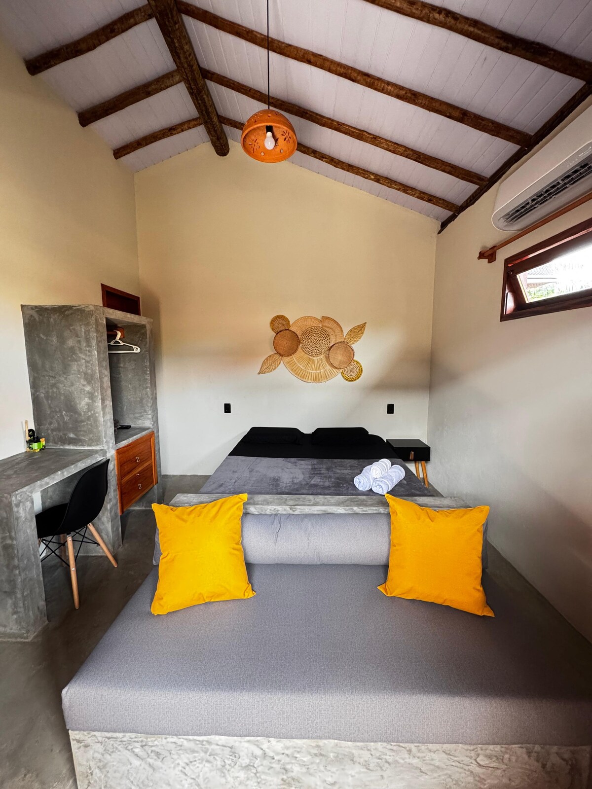 Opustite se u ovoj šarmantnoj, privatnoj, mirnoj i konceptualnoj planinskoj kući s dvije spavaće sobe koja se nalazi na plaži Morro Branco, Cajueiro da Praia, Piauí. Prostor je udaljen 400 metara od mora Morro Branco i samo 8 km od poznatog sela Barra Grande. Ima 02 sobe sa zrakom, 1 kupatilo , kuhinju opremljenu šporetom, frižider, osnovne kuhinjske potrepštine, trpezariju, balkon, vanjski pomoćni prostor s visećim ležaljkama,stolove, stolice, ekskluzivni parking, udoban smještaj do sedam osoba.