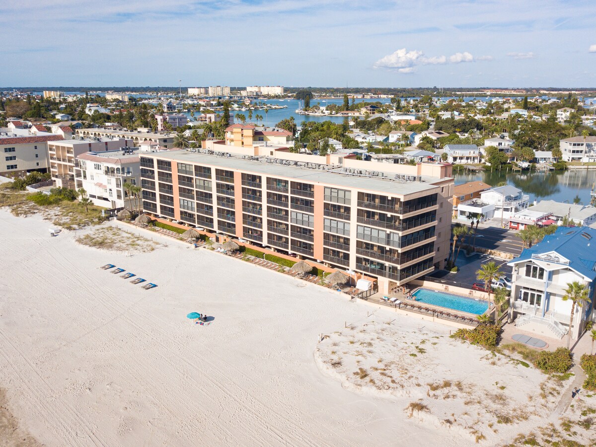 Imajte na umu da su teretana, jacuzzi i masažna kada privremeno zatvoreni(šteta od uragana) Potpuno renoviran, uređena tema plaže, lijepo namješten stan na drugom spratu samo nekoliko koraka od bijele svilenkaste pješčane plaže! Idealno za romantični odmor, medeni mjesec i odmor! Smješten u Madeira Beach Yacht Clubu, privatnoj ograđenoj zajednici, besplatan parking, brzi WI-FI, TV kablovska, Netflix, 2 vanjska grijana bazena i pristaništa za ribolov. Rezervišite najmanje 7 dana prije dolaska