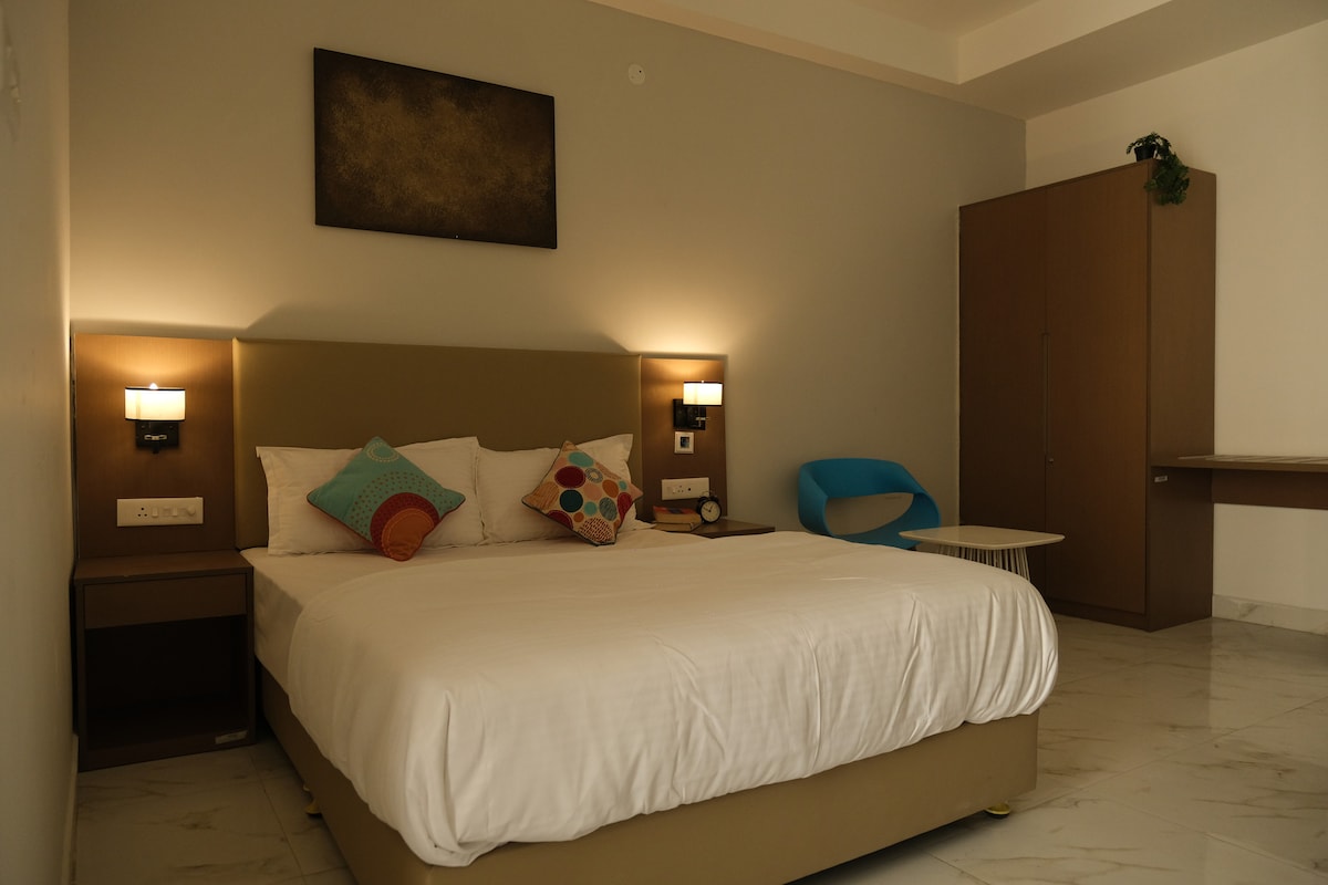 Experience luxury and comfort in our Executive Suite in Hyderabad, perfect for business travelers or couples seeking a premium stay. This elegantly furnished suite features a spacious bedroom, modern ensuite bathroom, high-speed Wi-Fi, air conditioning, and a dedicated work desk. Located in a prime area with easy access to IT hubs, shopping centers, and restaurants, it offers both convenience and class.