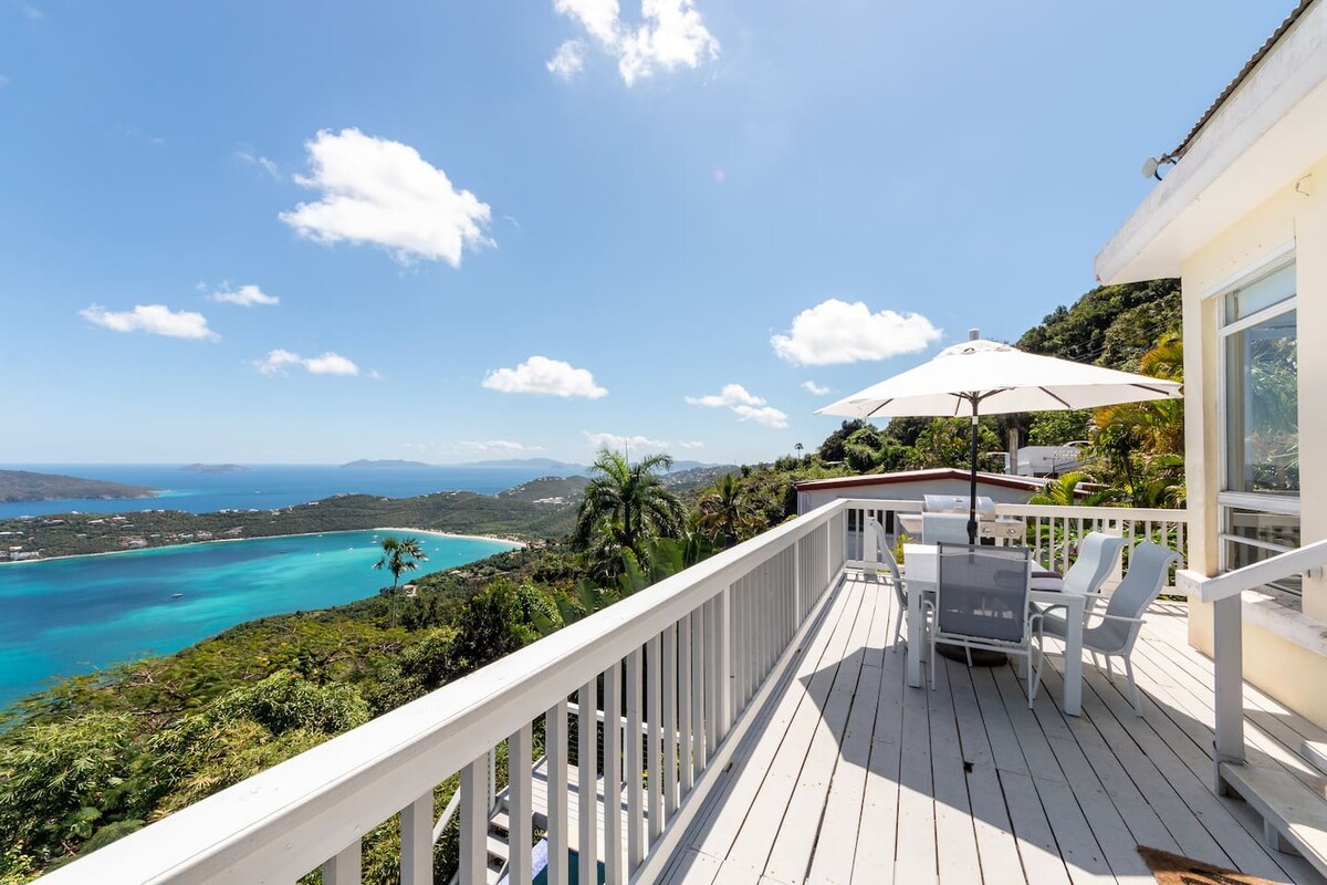 Relax with the sound of ocean waves in your private, panoramic-view paradise! This stand-alone home features 2 brand new king beds, 2 New Full Beds, 2 New single couch pull out sleepers,A/C bedrooms, a chef's kitchen w/ gas range & fast WiFi, and standby generator. Breeze-filled living spaces open to stunning views extending to St John! 7-seat SUV for unforgettable island adventures. Kid friendly perfect for families. Easy parking + quiet private location. A super central incredible value!